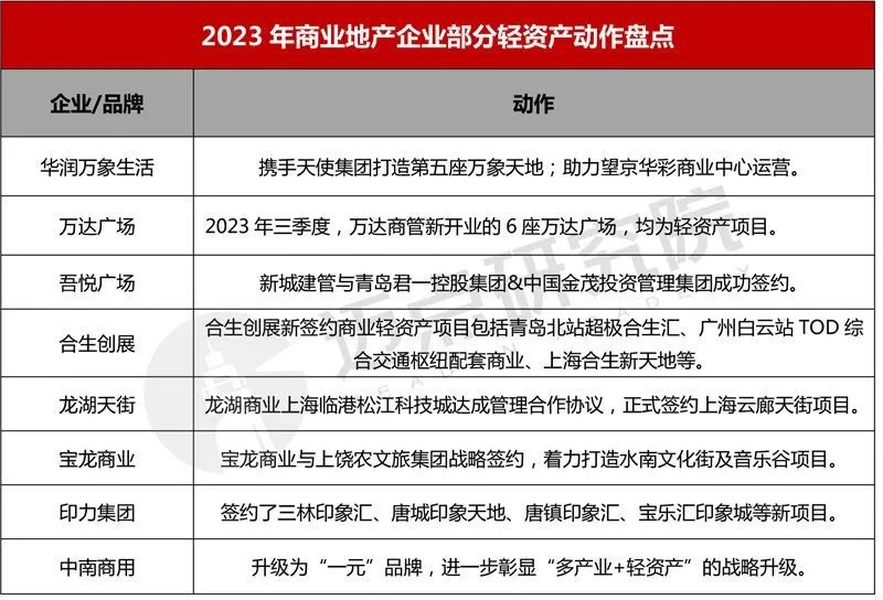 随着商业地产行业发展日渐成熟,进入存量市场,轻资产化转型成为行业主流。越来越多的企业从重资产运营模式开始向轻资产运营模式转型,以管理能力和增值服务收益为核心,逐步扩大轻资产业务的规模。具体来看,已入局的企业纷纷加码轻资产,如华润、万达、新城、合生创展、龙湖、宝龙和印力等纷纷提速轻资产项目的布局。