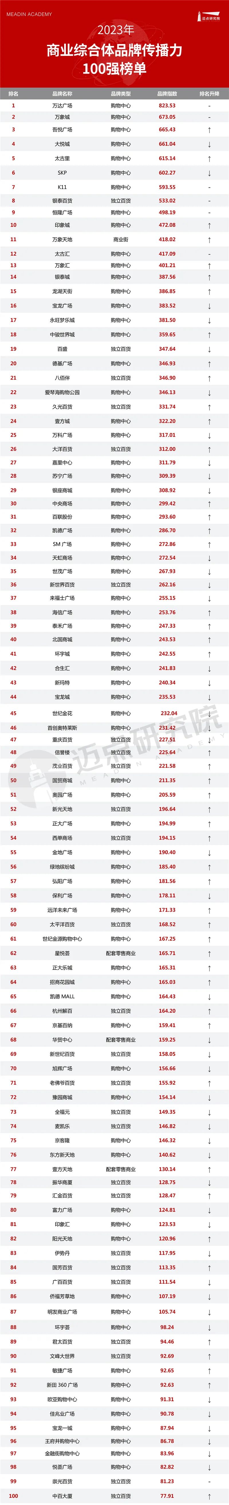 排名前十的品牌依次是:万达广场、万象城、吾悦广场、大悦城、太古里、SKP、K11、银泰百货、恒隆广场、印象城。本年100强榜单中,48个品牌的品牌排名环比上升;45个品牌的品牌排名环比下降;7个品牌的品牌排名环比没有变化。