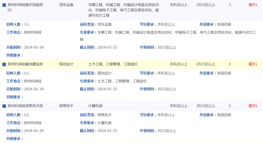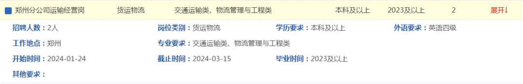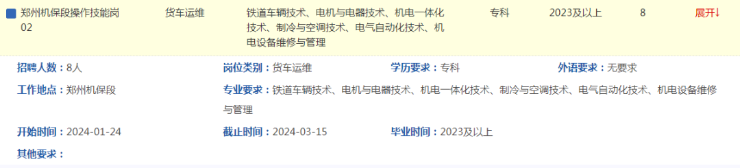 2. 品行端正,遵纪守法,思想政治素质优良,热爱铁路特货事业。3. 身心健康,具有正常履行岗位职责的身体条件,其中,操作技能岗位无色盲色弱。具有良好的团队协作意识,服从公司对岗位的安排和调整,素质能力适应公司工作岗位要求。5. 专科(高职)毕业生在校期间所学专业为铁路相关方向,所学主要课程为铁路主专业课程。1. 网上报名。应聘者请登录“中国铁路人才招聘网”(http://rczp.china-railway.com.cn)(首次登录需先进行注册)进行报名。应聘者须据实填报本人信息,按照要求上传本人身份证、教育部学籍在线验证报告(或教育部学历证书电子注册备案表)、毕业生就业推荐表、成绩单等证明材料扫描件,报名截止日期为2024年3月15日。请认真阅读岗位条件、根据本人所学专业、意向岗位对口报考,每人限报两个岗位。2. 简历筛选。根据报名情况,在符合条件的人员中择优确定笔试、面试人选,并通过电话、短信、邮件等形式通知,未入围者恕不通知。3. 考试考核。接到通知的应聘者须按指定时间、地点参加考试,否则将视为主动放弃。招聘笔试、面试考核在2024年5月31日前完成,具体时间、地点另行通知。参加考试考核时应携带以下材料并进行现场确认:(1)国内高校毕业生:①中国铁路人才招聘网打印的《毕业生应聘登记表》(需本人签字);②毕业生就业推荐表(须学校盖章);③学习成绩单(须学校盖章);④教育部学籍在线验证报告(或教育部学历证书电子注册备案表);⑤英语四、六级成绩单;⑥本人身份证、户口簿首页及本人页复印件;⑦其他资格证书、获奖证书等证明本人资历能力的材料;⑧近半年内二级甲等及以上医院健康体检报告(血压、辨色力、视力、听力、心电图、胸片、血常规、尿常规、肝功能、肾功能为必检项目,报告必须有检查结论)。(2)国外高校毕业生:①中国铁路人才招聘网打印的《毕业生应聘登记表》(需本人签字);②教育部留学服务中心出具的《国外学历学位认证书》及国外院校学位证书(复印件及翻译件,在读学生请提供学校出具的在读证明并附中文翻译件)③国外院校录取材料;④学习成绩单(附中文版);⑤近半年内二级甲等及以上医院健康体检报告(血压、辨色力、视力、听力、心电图、胸片、血常规、尿常规、肝功能、肾功能为必检项目,报告必须有检查结论)。4. 结果公示。拟录用人员名单将在中国铁路人才招聘网公示。1. 应聘人员应承诺有关报名信息和所提交应聘材料的真实、准确和完整。一经发现弄虚作假、作弊行为,以及其他违反招聘规定的,立即取消应聘资格。2. 应聘者在招聘期间应留意并保证联系电话、邮箱正常使用,避免消息遗漏。3. 中铁特货公司不委托任何第三方招聘,也不在招聘过程中向应聘者收取任何费用,请提高警惕,谨防受骗。4. 中铁特货公司保留对招聘公告及相关规定的最终解释权。咨询时间:工作日9:00-11:00、14:30-17:00