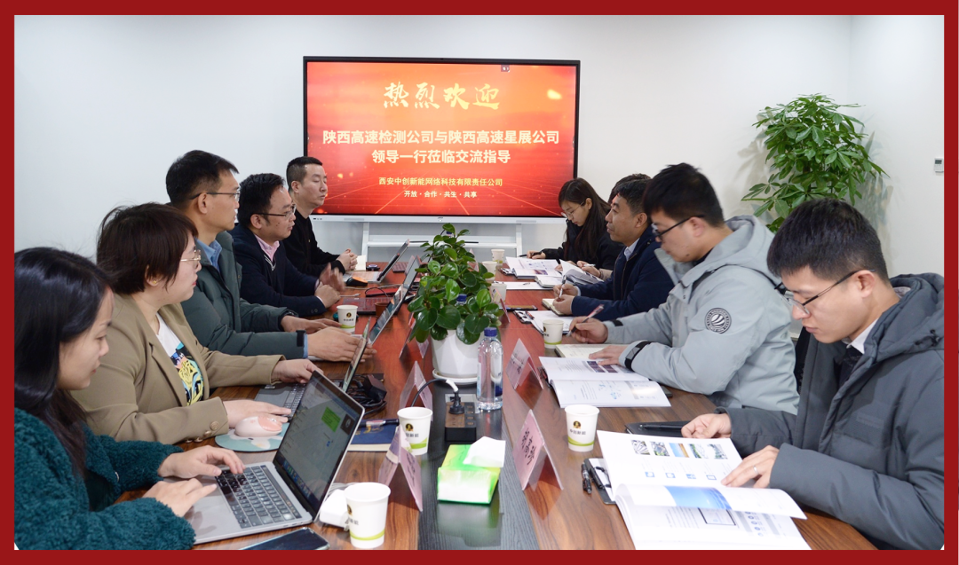 2024年1月25日,陕西高速公路工程试验检测有限公司(以下简称“陕西高速检测公司”)与陕西高速星展科技有限公司(以下简称“陕西高速星展公司”)领导一行莅临中创新能网络科技有限责任公司(以下简称“中创新能”)参观交流,中创新能总经理吴林河先生携核心高管参与接待。此次来访旨在以跨界融合为引领,寻求企业更好的发展。