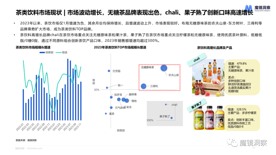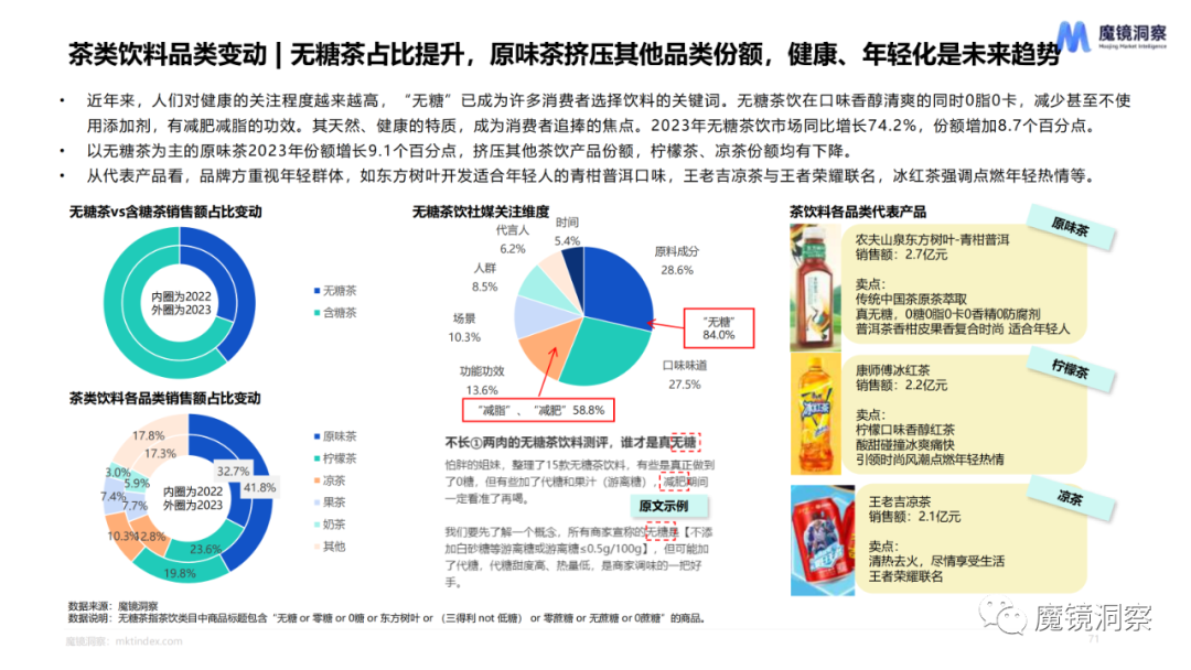 健康化趋势主要体现在各大品牌在成分减法上的努力,无糖茶饮、无糖碳酸饮料推动无糖饮料的稳定增长;NFC、鲜榨果蔬汁以鲜榨无添加为卖点,助力健康化饮料快速增长;2023年饮料消费者对健康化产品需求助力饮料赛道稳定增长。2023年,零添加、减盐、有机等成为生抽蚝油企业上新的热词,并逐渐蔓延至调味品全品类,推动调味品行业稳定发展;冷链运输逐渐成熟,低温乳制品热销,与中老年奶粉共同助力乳制品市场稳定增长。