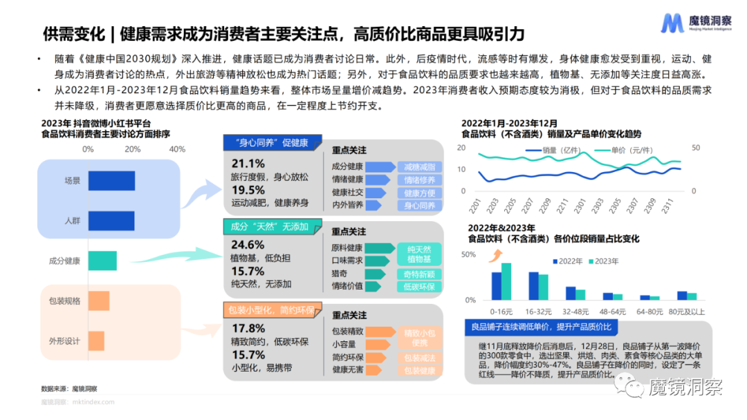 2023年消费者收入预期态度较为消极,但对于食品饮料的品质需求并未降级,消费者更愿意选择质价比更高的商品,在一定程度上节约开支,高质价比商品成为消费者最优选择。2023年各大平台加大酒类补贴,百亿、百补酒类商品销售额快速增长,助推线上酒类市场快速增长。各大品牌也在积极寻求对策,迎合消费者高质价比需求。良品铺子连续调低单价,继11月底释放降价后消息后,12月28日,良品铺子从第一波降价的300款零食中,选出坚果、烘焙、肉类、素食等核心品类的大单品,降价幅度约30%-47%,以此来提升产品质价比,满足消费者需求。