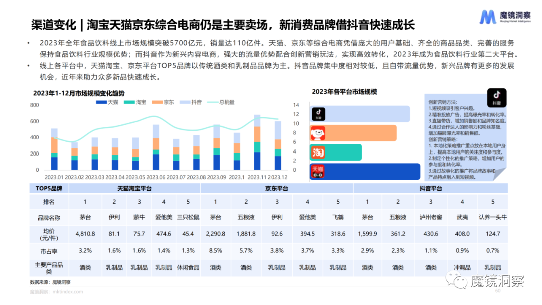 2023年全年食品饮料线上市场规模突破5700亿元,销量达110亿件。天猫、京东等综合电商凭借庞大的用户基础、齐全的商品品类、完善的服务保持食品饮料行业规模优势;而抖音作为新兴内容电商,品牌集中度相对较低,且自带流量优势,强大的流量优势配合创新营销玩法,实现高效转化,新兴品牌有更多的发展机会,近年来助力众多新品快速成长。