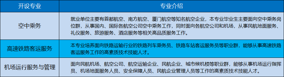 定向培养精通国内外民航服务专业知识,熟练掌握专业技能,具备较高外语水平和团结协调能力,具有良好政治素养、文化艺术素质、航空服务专业素质和身体素质, 适应民用航空及交通运输事业需求与发展的高级复合型、应用型服务人才。空中乘务专业以就业为导向,以锻造学生综合素质为主线,以提升学生实践能力为重点,突出教学实践环节。学院拥有航空票务、值机、行检、安检、空中乘务训练舱、应急撤离训练舱等一流的航空实训中心,能全方位满足航空服务专业学生的技能培养训练需求。