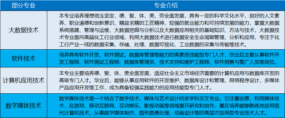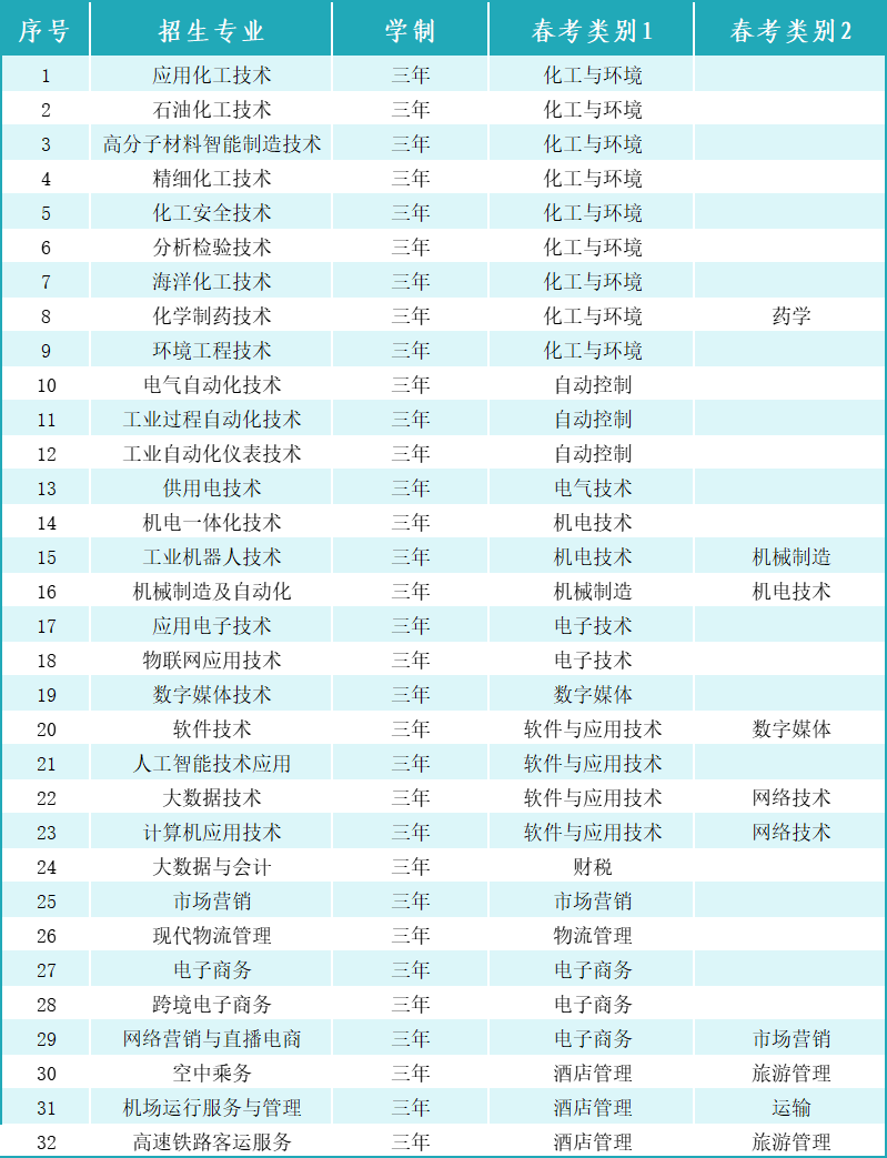 学院2024年单独招生/综合评价招收普通高职专业36个。分化工类,含应用化工技术、高分子材料智能制造技术、精细化工技术、石油化工技术、分析检验技术等专业;机电类,含机电一体化技术、机械制造及自动化、工业机器人技术等专业;管理类,含大数据与会计、市场营销、电子商务、现代物流管理、金融科技应用、财富管理等专业;电子信息类,含软件技术、人工智能技术应用、应用电子技术、物联网应用技术等专业;酒店管理类,含空中乘务、机场运行服务与管理等专业。招生对象为参加春夏高考的应往届毕业生,代码D319。