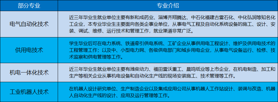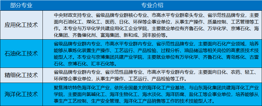 学校化工专业特色优势明显,是省内唯一一所服务于化工行业全产业链的全日制公办高职院校。学校始终坚持立足化工产业、服务区域经济发展、推动新旧动能转换的发展目标,注重工学结合,成立“润丰班”等企业订单班,连续多年为齐鲁石化、烟台万华、上海石化、青岛炼化、中油济柴、潍柴动力、新和成等企业输送了大批优秀技能型人才。近年来,化工自动化技术专业群成功获批山东省高水平专业群和潍坊市高水平专业群;化工技术专业群作为山东省高等职业院校品牌专业群建设项目之一,是校企共建共享、特色鲜明、省内一流的化工技术类品牌专业群,多年来为服务区域经济发展培养了精细化工、清洁能源、石油化工、轻工、建材、新型材料、药物化工、海洋化工及管理等领域的高素质技术技能型人才。