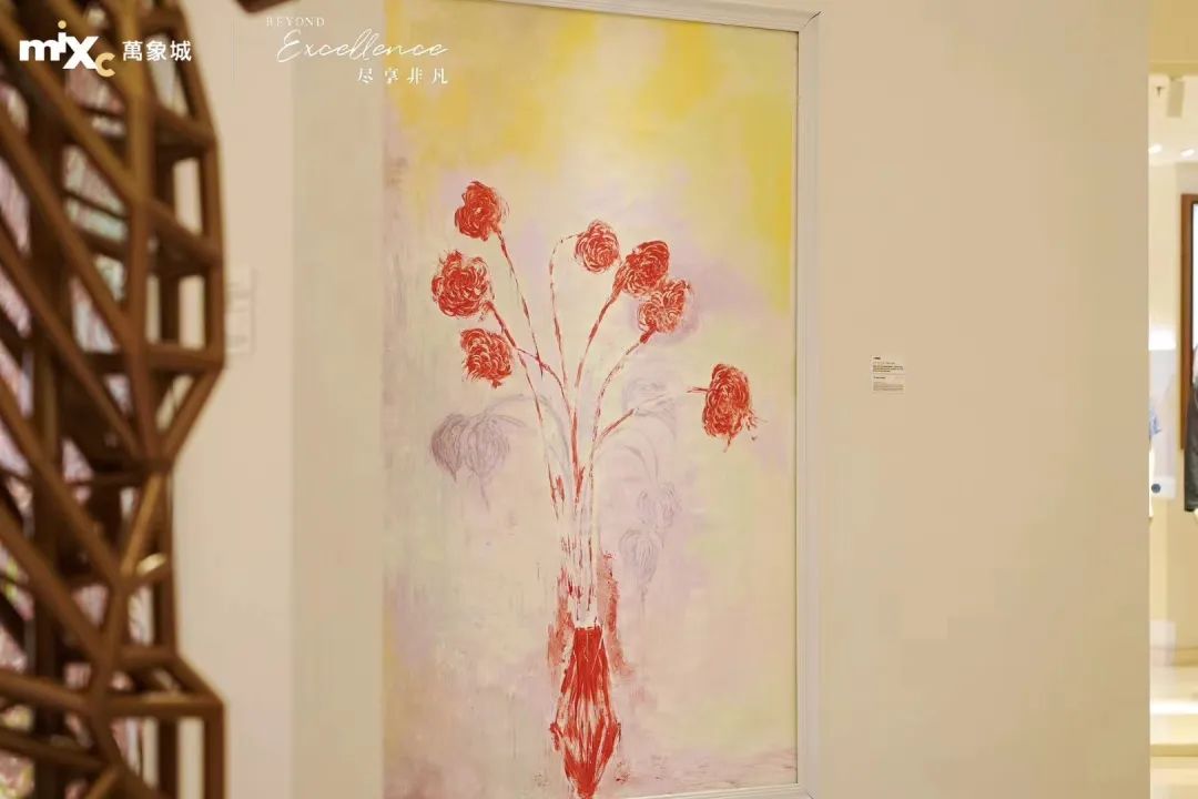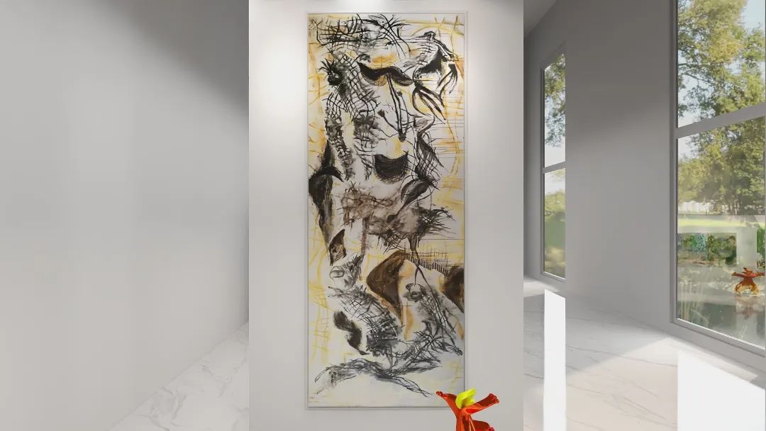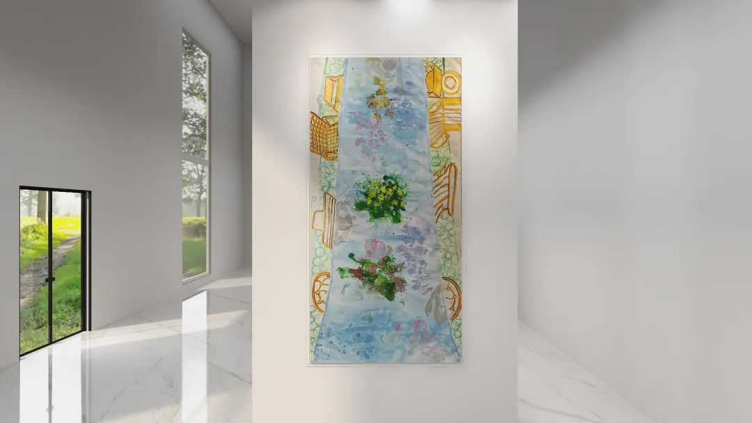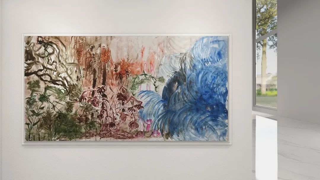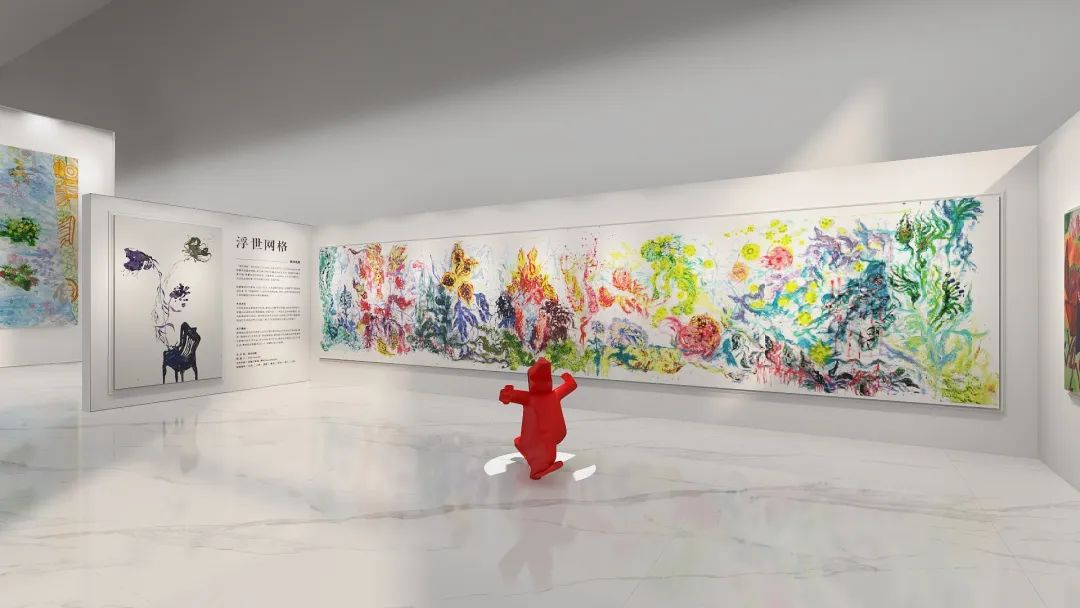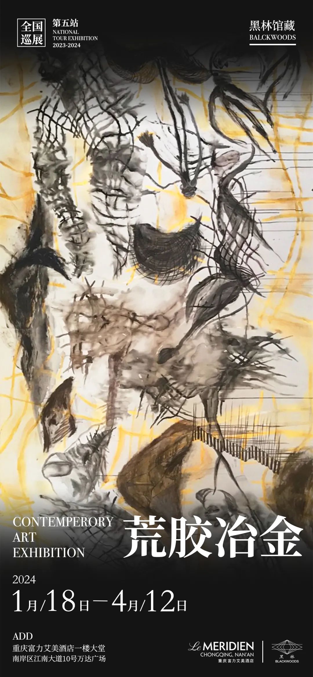 “荒胶冶金”是本次展览的名称,也是本次展览的主轴画作 :金色网格新进,恰如此时新年;黑色网格如去岁,渐渐退出,新旧交替,新旧交替正是《荒胶冶金》画作所构筑与反应的画面内容。《荒胶冶金》是黑林馆藏收藏的5.9米竖轴画作,截止目前,黑林收藏竖轴作品3幅,借由重庆展厅的开阔空间,均在不同时段进行展陈,本次展览还展出的竖卷作品为《不散宴席》,流水筵席随蓝色丝带派送,源源不断,两旁座椅空无一人,桌上盆花绽放,在画面形成强烈对比。