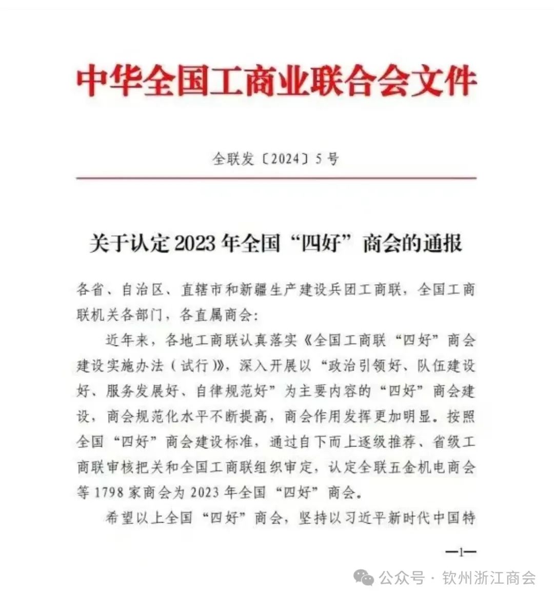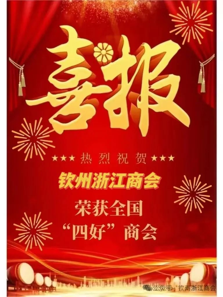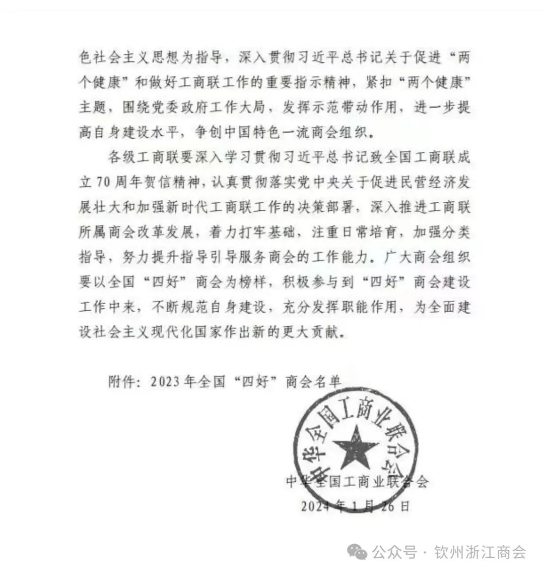 1月26日,中华全国工商业联合会印发《关于认定2023年全国"四好"商会的通报》,钦州浙江商会被认定为全国"四好"商会,我会将珍惜荣誉,再接再厉,不忘初心,在全体理事会成员的带领下,紧扣"两个健康"主题,围绕党委政府工作大局,充分发挥示范带动作用,以更高站位、更优服务、更大力度为建设壮美广西作出更大贡献!