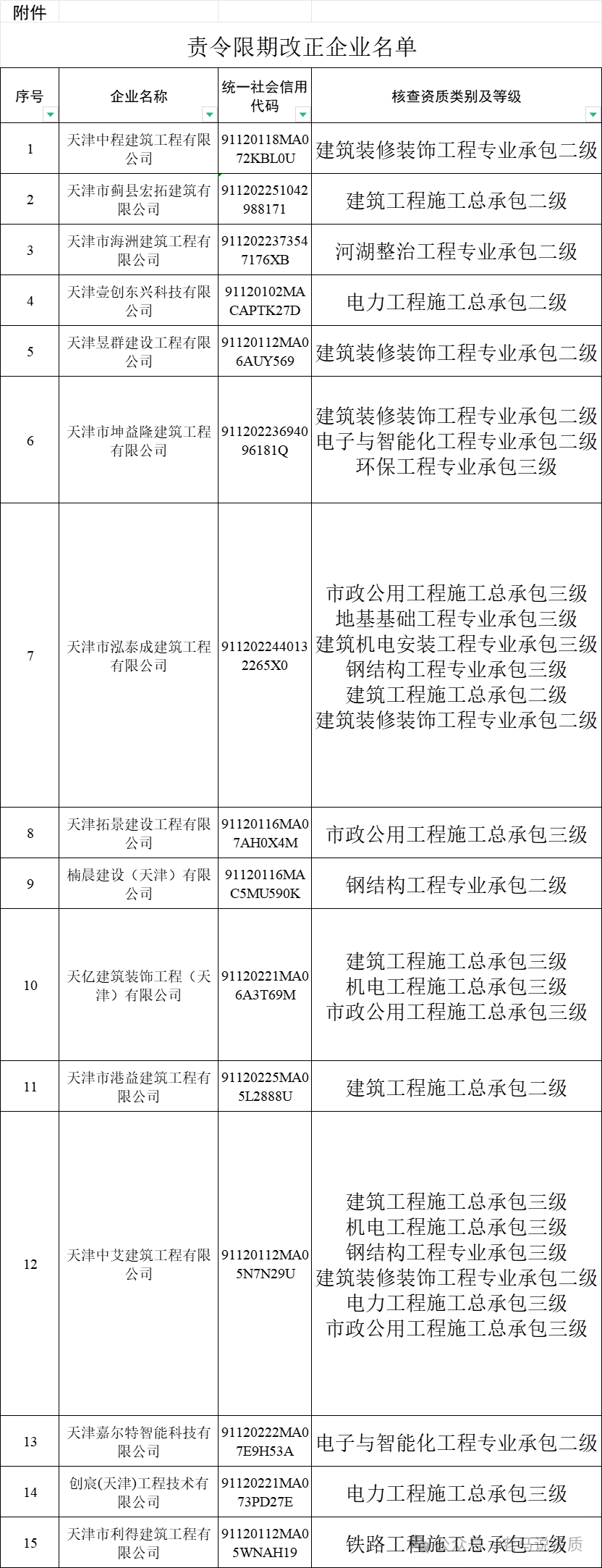 在我委2023年建筑业、工程监理企业“双随机、一公开”动态核查中,天津中程建筑工程有限公司等15家单位(详见附件)核查结论为不合格,且未主动完成整改,根据《建筑业企业资质管理规定》,我委责令上述单位在3月4日前完成整改,达到资质标准要求的条件并持续保持。整改期间,企业不得申请建筑业企业资质的升级、增项,不能承揽新的工程。逾期仍未达到建筑业企业资质标准要求条件的,我委将依法撤回相应资质。在整改期间因承揽业务造成的法律后果由企业自行承担。