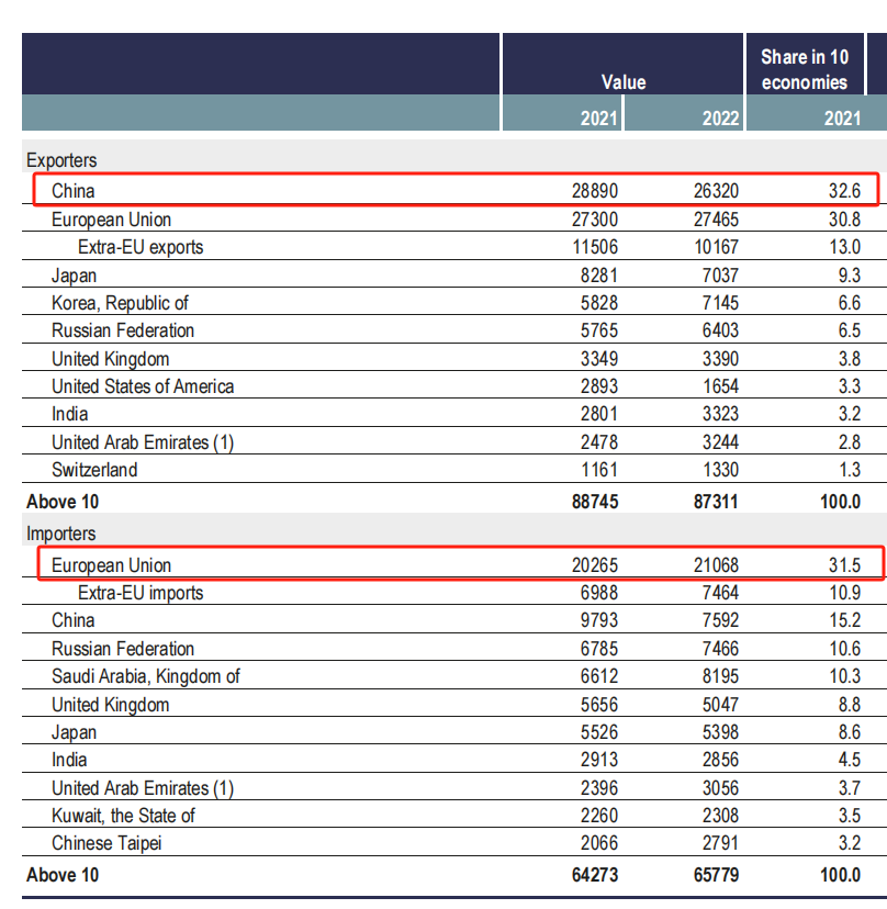 WTO全球2021-2022主要的建筑建材行业出口商和进口商及其贸易占比