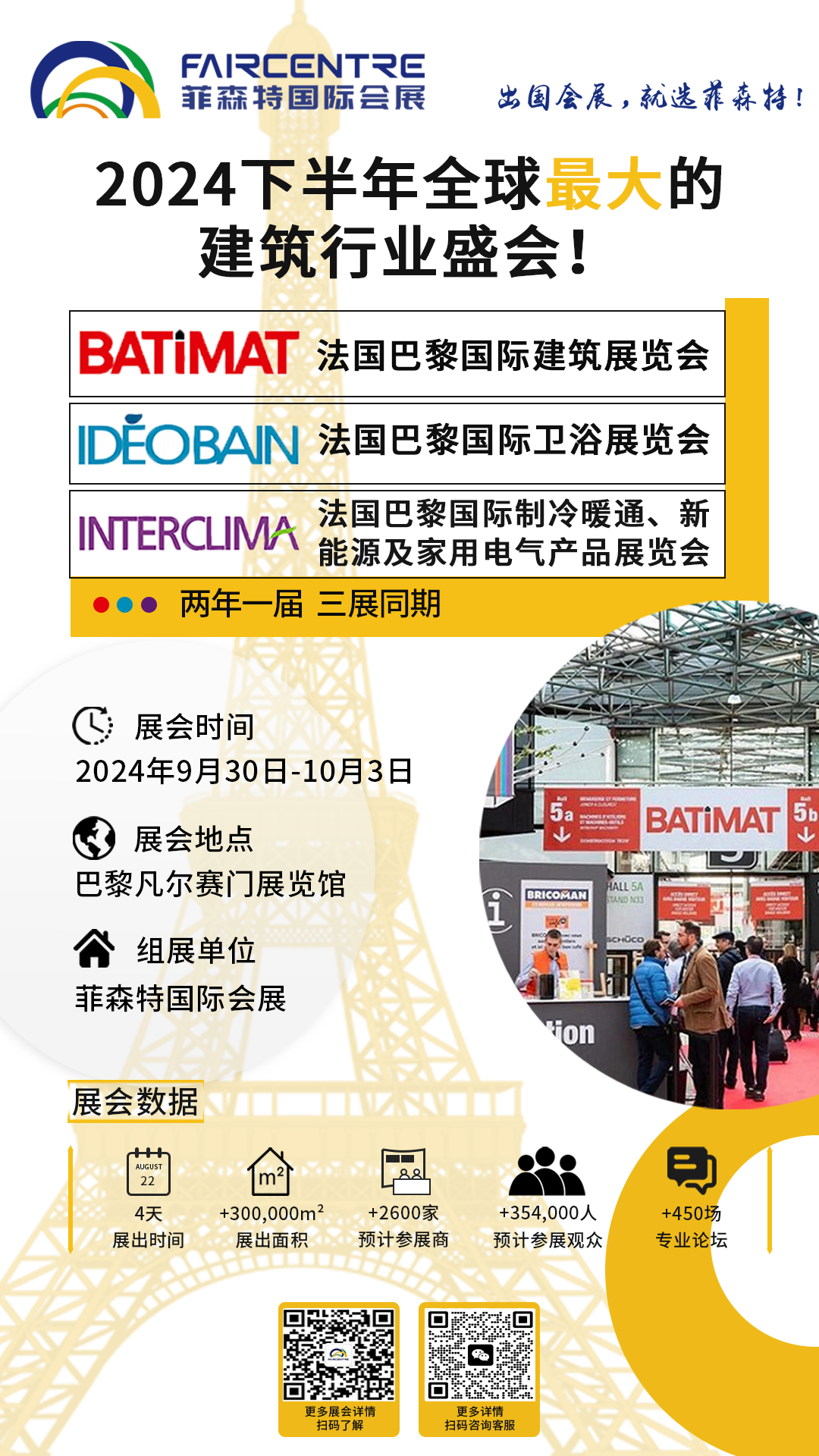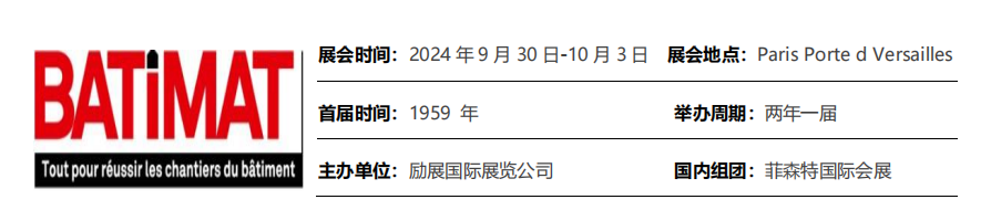 BATIMAT自1959年创办以来,每两年举办一届,其规模日益扩大,影响力波及全球,展会以“成为建筑领域的创新者”为核心不断地改进。现已发展成为世界第一大建材及设备展。本届展会举办时间为2024年9月30日-10月3日(4天),同期还有法国巴黎国际卫浴展览会(IDEOBAIN)以及法国巴黎国际制冷暖通、新能源及家用电气产品展览会(INTERCLIMA)。
