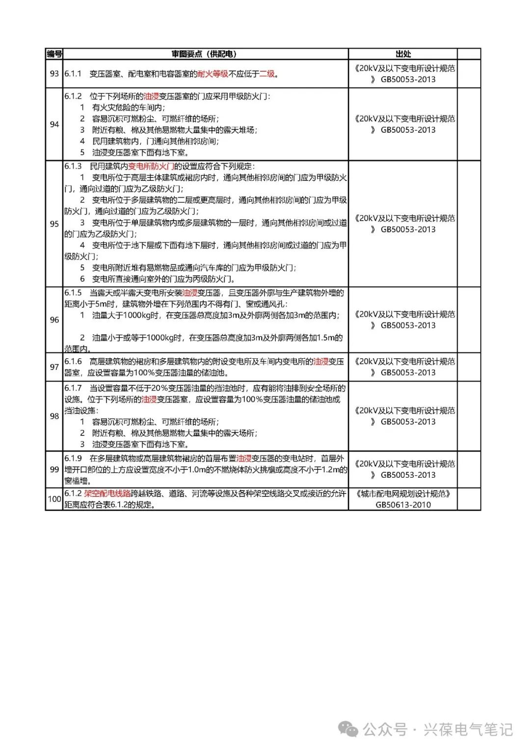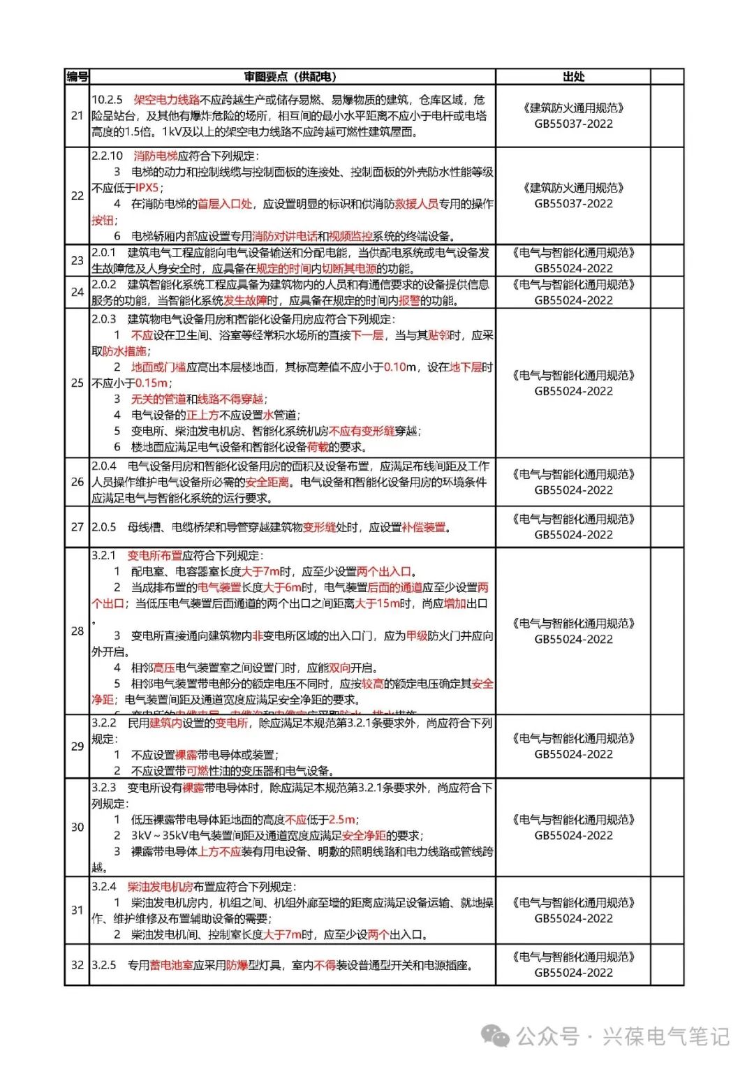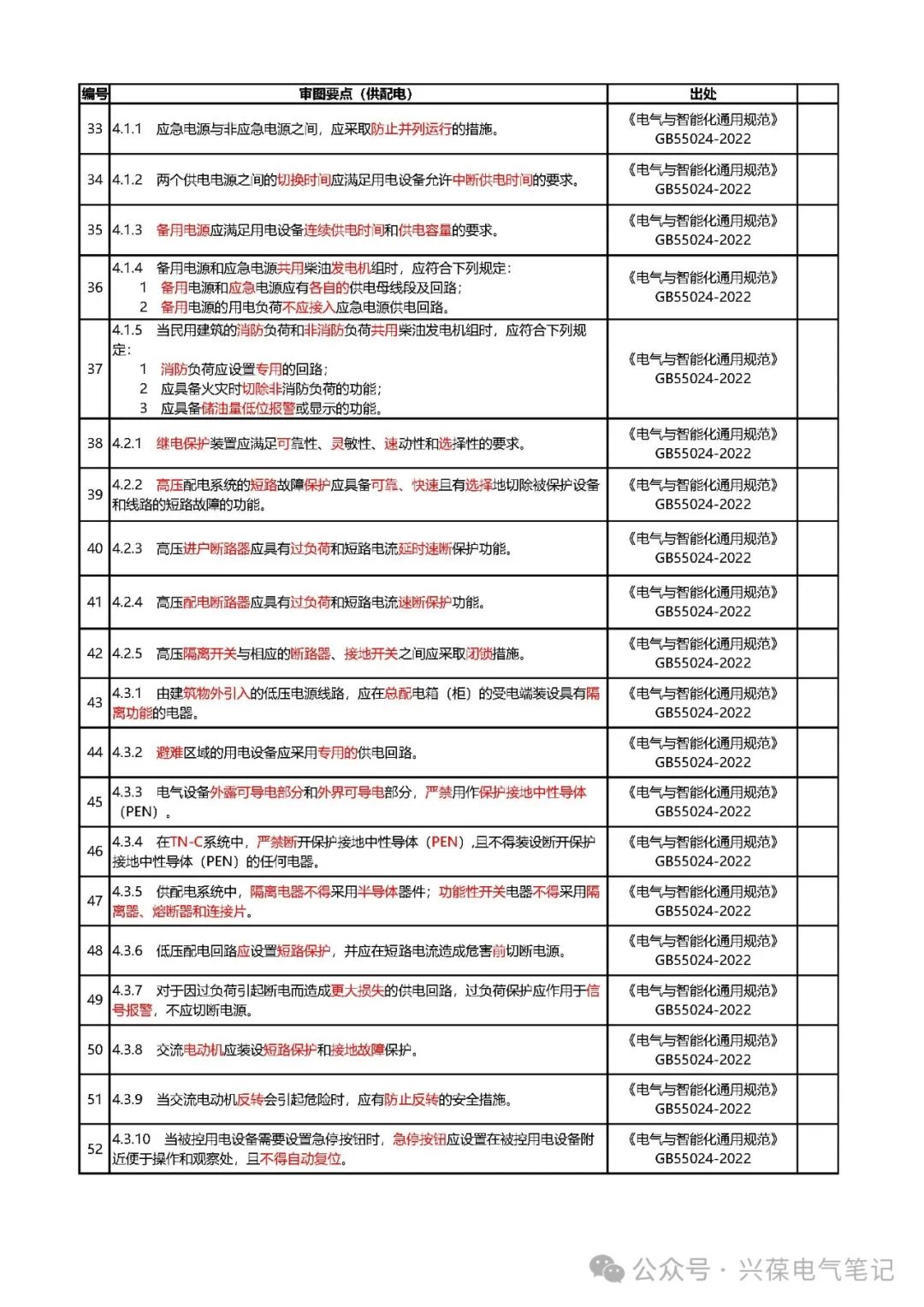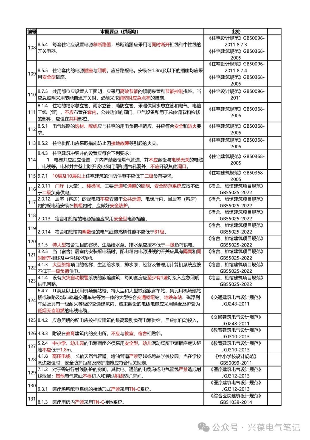 以下内容为电气专业强制性条文审图要点-供配电相关内容的整理,分类整理有利于提高审图或设计自校的工作效率,比如某个项目仅涉及供配电系统设计,那直接利用供配电系统相关强条进行核对即可,不需要再去核对其他部分内容,节省时间。强条部分整理会分为火灾报警、供配电、防雷接地、照明、弱电、人防、节能、绿建、施工等部分,整理好后会在公众号内发布,如有需要请关注。
