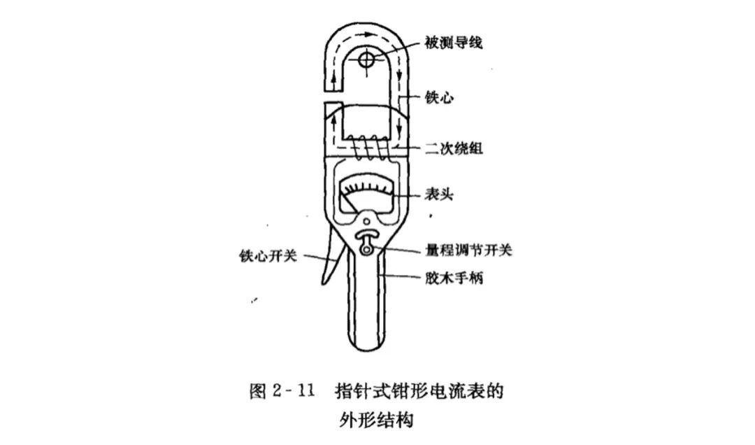 指针式钳形电流表俗称钳表、卡表,它是由一只电流互感器、钳形扳手和一只整流式磁电式反作用力仪表所组成的,其外形结构如图2-11所示。
