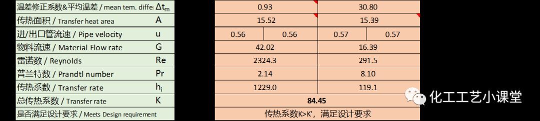 3.2 查询管壳式换热器传热系数表和污垢系数表,填入相应数据,取管壳式换热器总传热系数表范围的中间值,先试算该换热器的换热面积,由计算出的换热面积选取一款接近的列管尺寸和管程数,核算总传热系数是否满足设计要求,如低于之前选取总传热系数,需再次降低总传热系数值重新核算换热面积和总传热系数,直至满是设计要求。