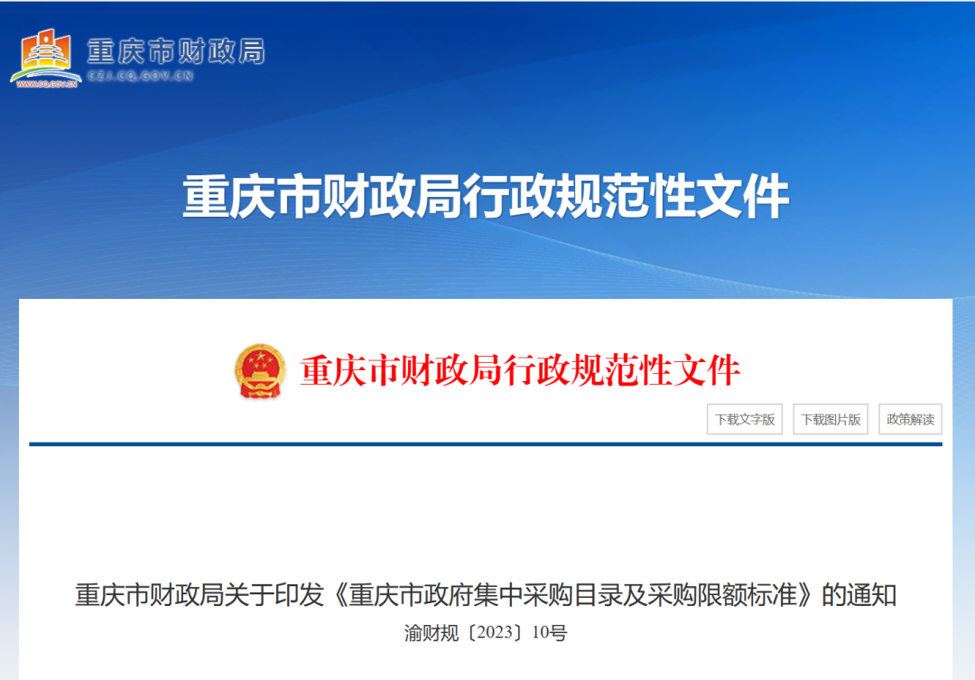 日前,重庆市财政局正式印发《重庆市政府集中采购目录及采购限额标准》,自2024年1月1日起执行。