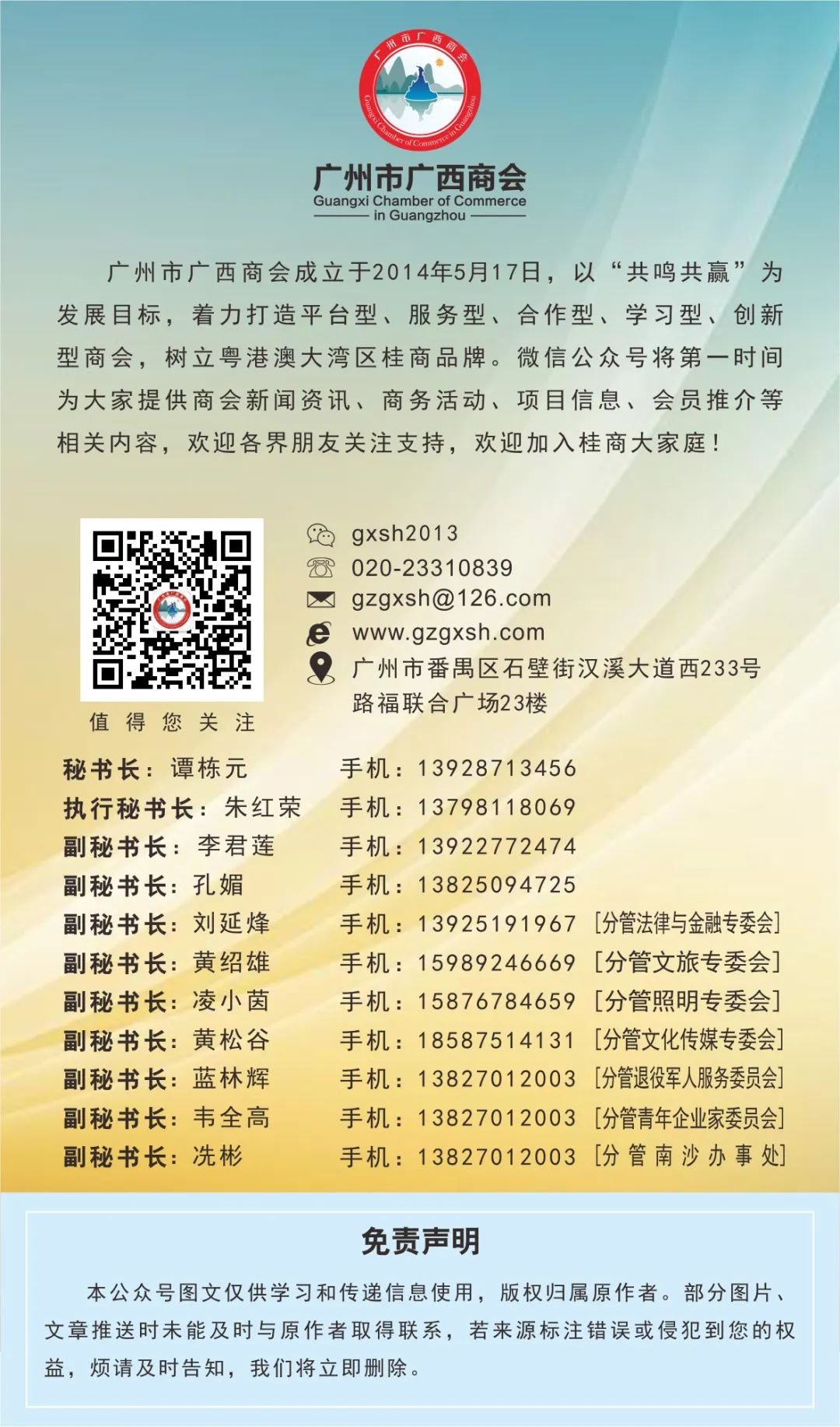 广州市广西商会参会人员还有:常务副会长兼文旅专委会会长、值班会长陈文忠,副会长李炳锋、方运林、苏瑞腾,监事莫超焕,会员梁宏,副秘书长李君莲等人。