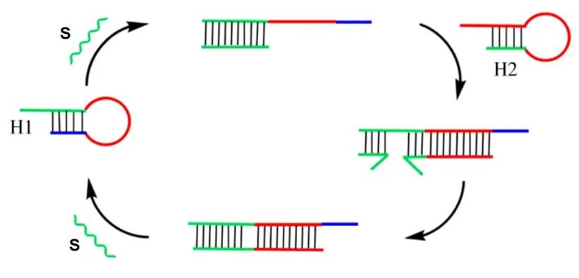 核酸扩增方法是一种重要的分子生物学技术,它可以在体外扩增DNA或RNA分子,从而使其数量增加到足够的程度,以便进行进一步的研究。在该项课题研究中,核酸扩增方法主要包括基于有酶介导核酸扩增方法和基于无酶介导核酸扩增方法。基于有酶介导核酸扩增方法主要包括基于重组酶聚合酶扩增 (RPA)方法、基于分支滚环(RCA)扩增方法、基于重组酶辅助扩增 (RAA)方法等。此类方法存在一定的局限性,比如需要重组酶、聚合酶等蛋白质,存在潜在的携带污染;而且操作繁琐,酶类蛋白质保存条件苛刻,不易保存;基于无酶介导核酸扩增方法主要包括基于催化发夹自组装 (CHA)方法、基于杂交链式反应 (HCR)方法等,其不仅仅有高的捕获分析物的效率和良好信号放大效果,而且不需要酶,操作简便,选择性多。因此,利用无酶核酸扩增联用基因编辑技术 (CRISPR/Cas12a)的形式来检测食源性病原体是一种新型且有效的新思路。其中,CHA反应的核心思路是通过精妙的核酸序列设计,设计单链的S链和形成茎环结构的H1链、H2链来形成dsDNA产物。在CHA反应当中,S链约为20-28 bp,为催化剂作用,H1、H2链长度不一,大约在40-65bp左右。S首先会与H1的“长臂”区域互补配对,打开H1链,形成S/H1中间体复合物,该复合物会与H2链配对,形成双链DNA产物,释放S链,S链再参与下一个CHA反应,以此为一个循环,产生大量CHA双链DNA产物(图1-2)。整个CHA反应过程中没有聚合酶的出现,为无酶扩增,通过巧妙的序列设计,通过化学键“打开、合成”的能量变化形成产物。