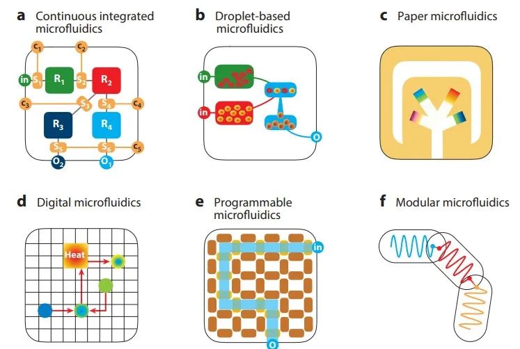 目前,微流控芯片主要有基于连续流体的微流控芯片、基于液滴的微流控芯片、纸基微流控芯片、数字化微流控芯片、可编程式微流控芯片和模块化微流控芯片。