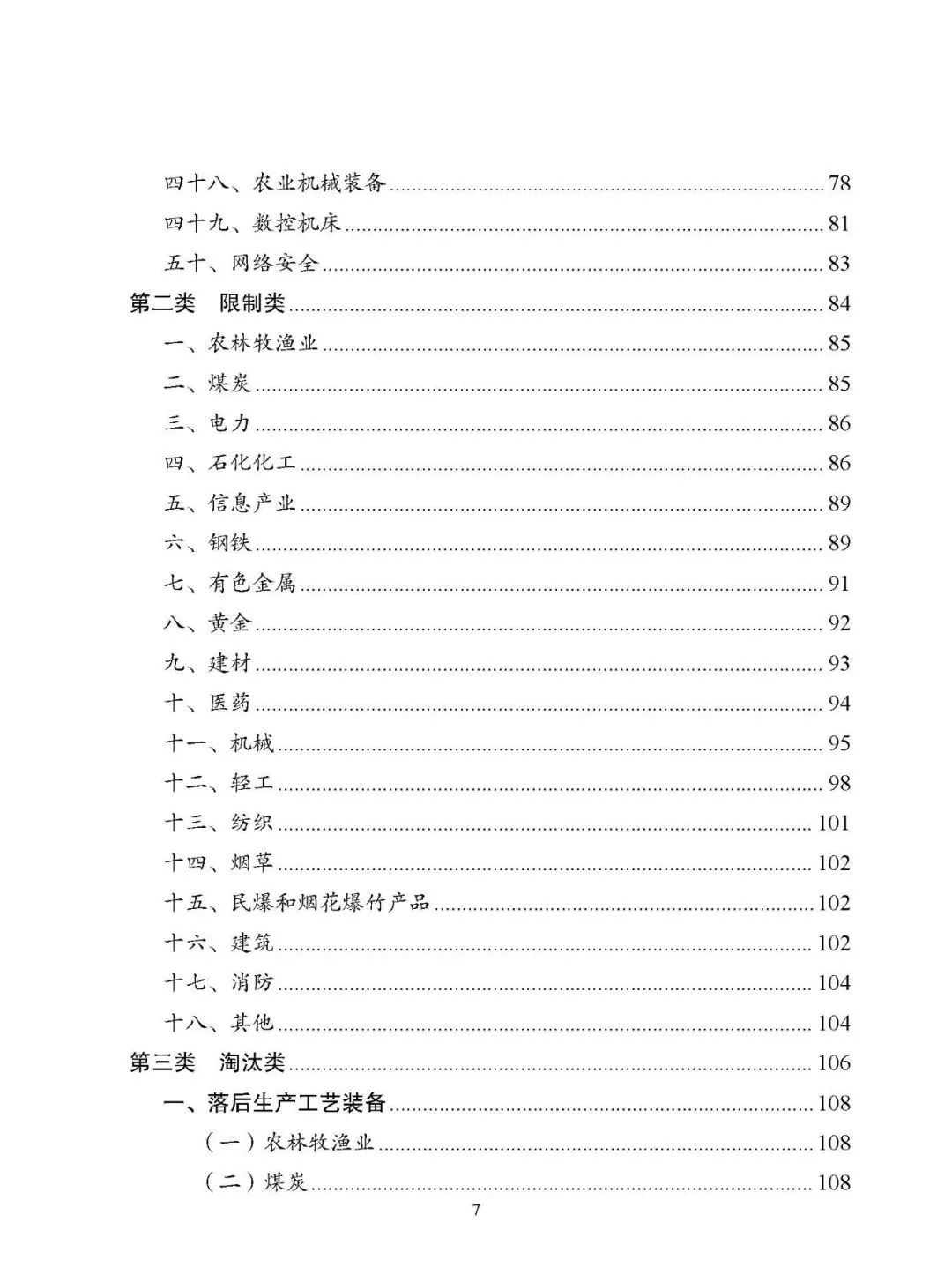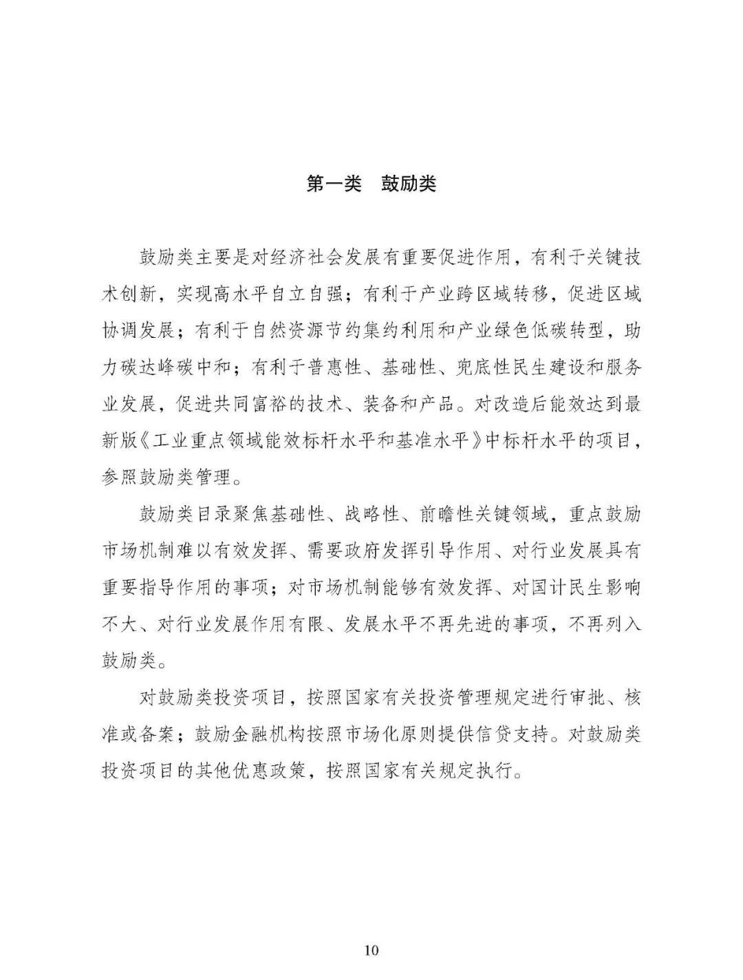 《目录(2024 年本)》由鼓励、限制和淘汰三类目录组成。鼓励类主要是对经济社会发展有重要促进作用的技术、装备及产品;限制类主要是工艺技术落后,不符合行业准入条件和有关规定,不利于安全生产,不利于实现碳达峰碳中和目标,需要督促改造和禁止新建的生产能力、工艺技术、装备及产品;淘汰类主要是不符合有关法律法规规定,严重浪费资源、污染环境,安全生产隐患严重,阻碍实现碳达峰碳中和目标,需要淘汰的落后工艺技术、装备及产品。鼓励类、限制类和淘汰类之外的,且符合国家有关法律、法规和政策规定的属于允许类。