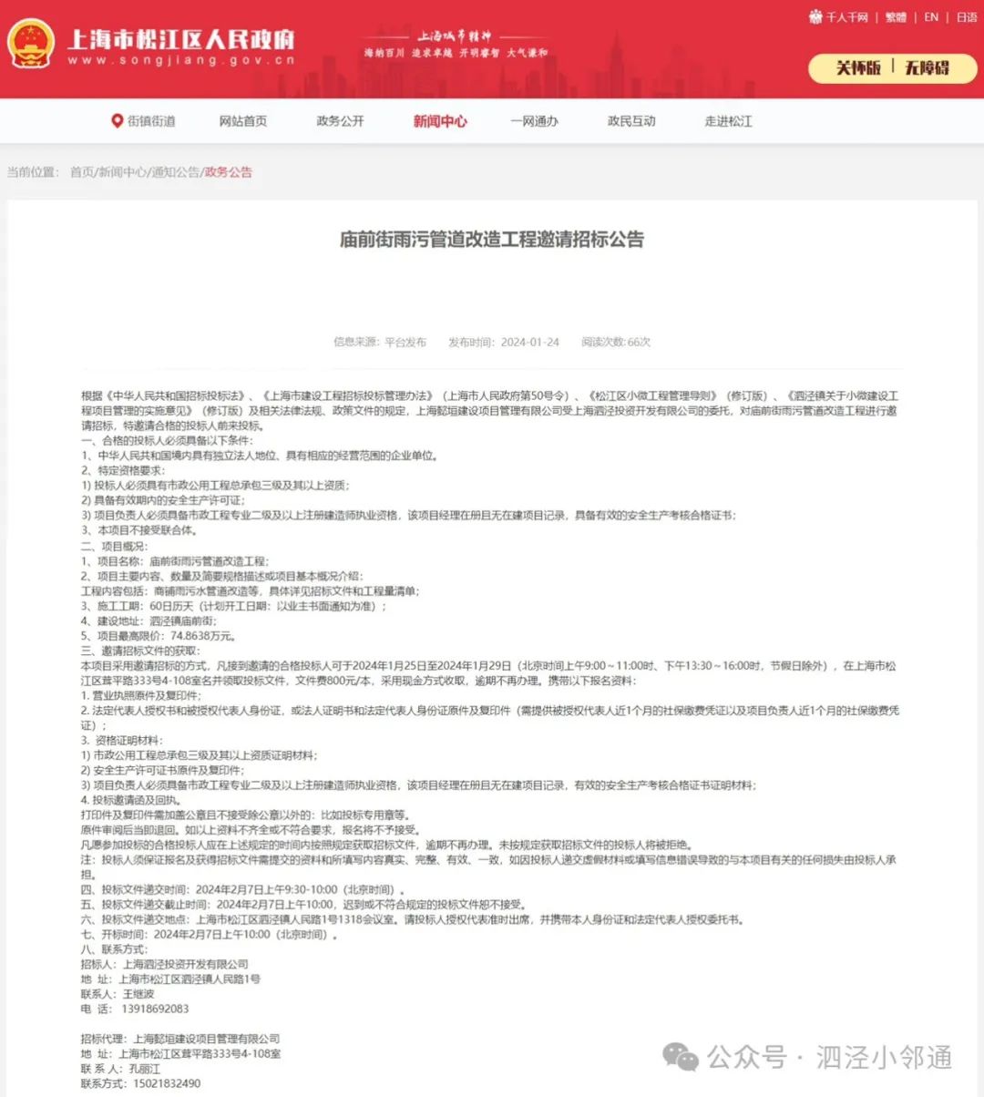 根据《中华人民共和国招标投标法》、《上海市建设工程招标投标管理办法》(上海市人民政府第50号令)、《松江区小微工程管理导则》(修订版)、《泗泾镇关于小微建设工程项目管理的实施意见》(修订版)及相关法律法规、政策文件的规定,上海懿垣建设项目管理有限公司受上海泗泾投资开发有限公司的委托,对庙前街雨污管道改造工程进行邀请招标,特邀请合格的投标人前来投标。