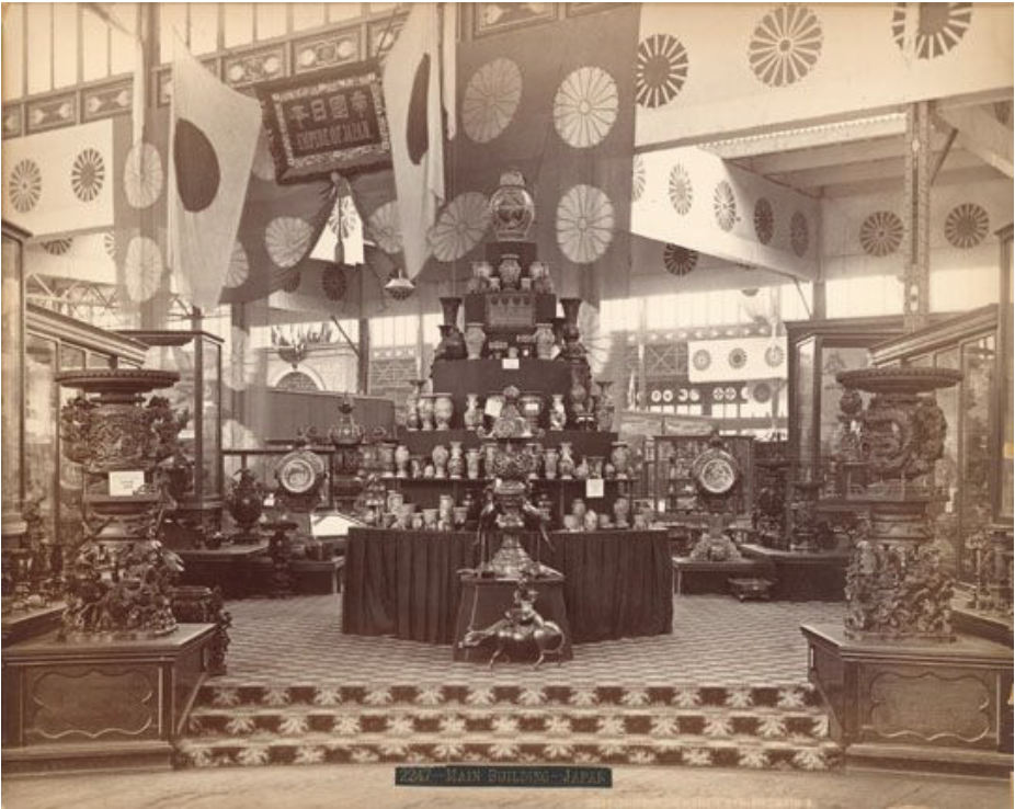 美国和日本两个国家各自希望费城博览会能够确立它们的国际重要性和实力。日本希望发展出口商品的市场,将参加国际博览会视为一个完美的营销途径。日本的组织者们在巴黎世界博览会(1867年)和维也纳世博会(1873年)上展出了他们的产品。到了1876年费城世博会,日本组织者展示出精明的商业头脑,他们利用分层的展台和展示区域周边摆放大型物品来吸引游客。他们将装饰性的悬挂物作为营销材料使用,因为这些悬挂物在整个长廊上都能被看到。