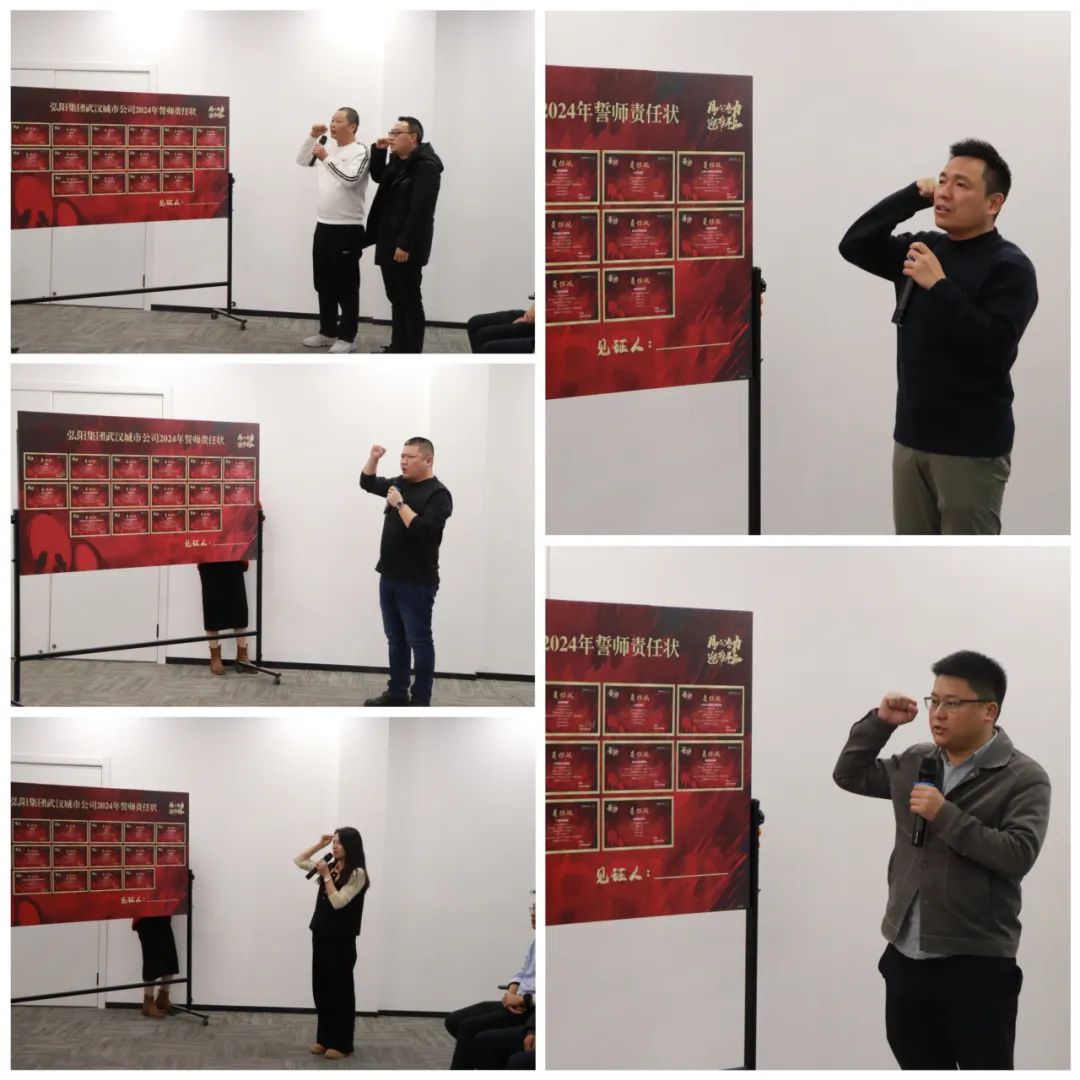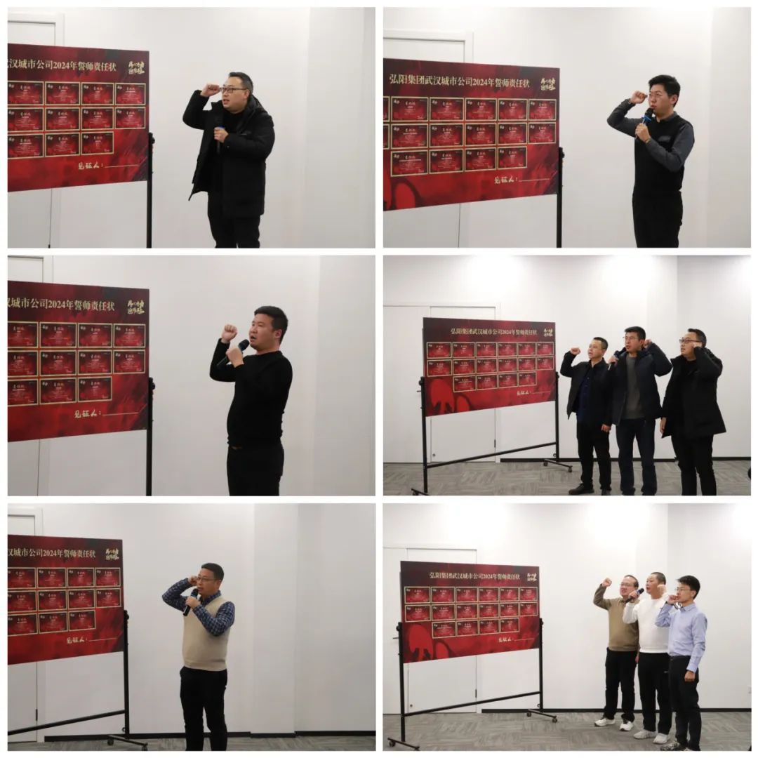 2024年度目标宣誓,管理团队依次上台庄严宣誓并签订责任状,伍总最后带领全体管理人员一同宣读武汉城市公司2024年度责任目标。