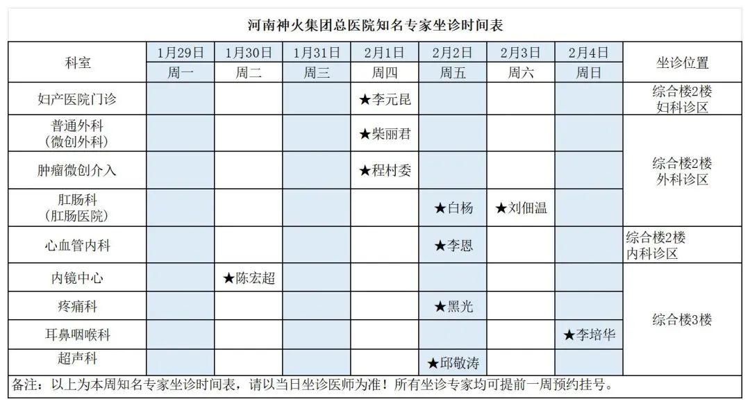 小编整理了神火总医院知名专家坐诊时间,帮助有相关问题的伙伴方便就医,下面是1月29日-2月4日知名专家坐诊时间表: