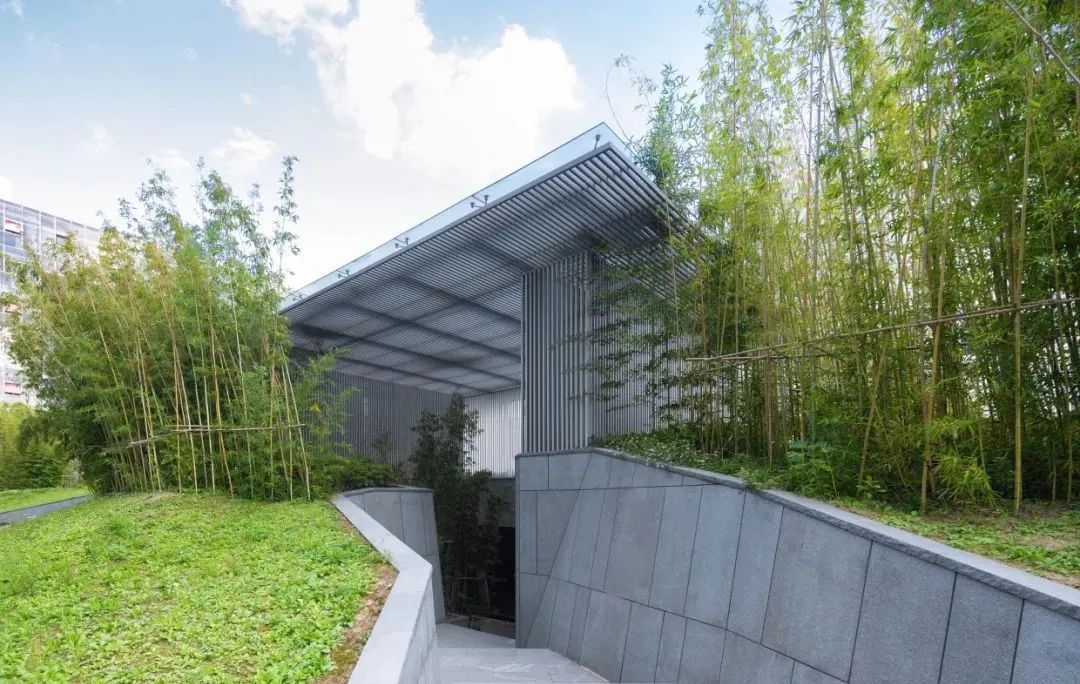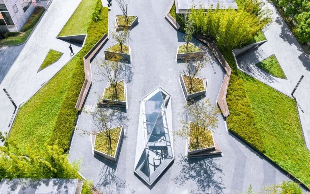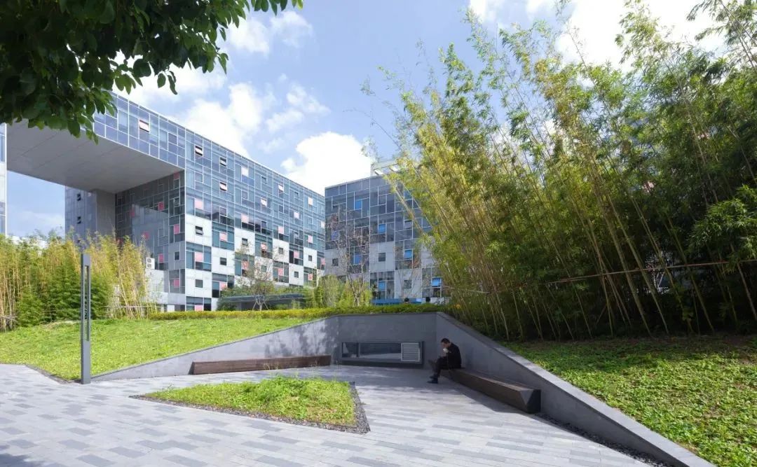 金桥万创中心内共有10栋楼,总建筑面积11万平方米。其中AB楼横跨园区,剩余楼栋皆以中心对称的方式,每三个为组团划分。组团中心为两层的地下车库,高出地面约为1.5米,同时上盖中央广场。