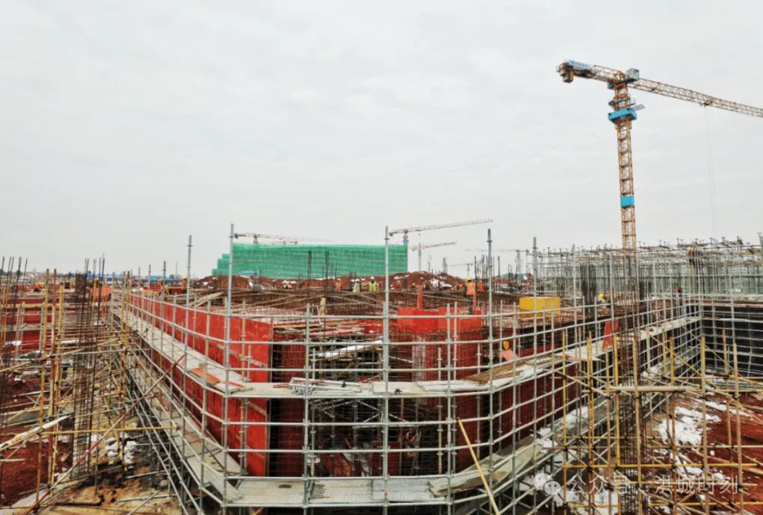 在主厂房东侧,作为生活配套的宿舍区已进入基础施工阶段。工人们正在进行地下室顶板施工,现场钢筋绑扎和模板搭设工作一片繁忙,春节前将完成2栋宿舍楼地下室土建施工。