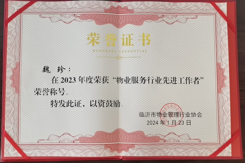 临沂市物业服务行业“先进工作者”荣誉称号