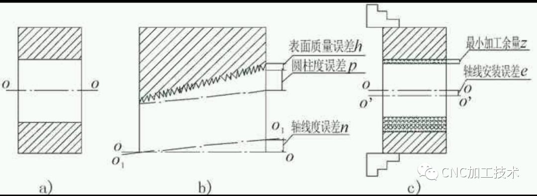 零件的加工余量不能过大但也不能过小,加工余量过小则不能消除前道工序加工过程中残留的形位公差和表面缺陷,从而影响产品质量。为了使零件的加工质量得到保证,各工序所留最小加工余量应能保证前工序最小加工余量的基本要求。某零件内孔最小加工余量构成因素示意图如图4所示。图4a)为所要加工内孔的零件。如果该孔在前道工序加工时轴线O1-O1偏离基准轴线O-O存在位置误差n,且内孔存在圆柱度误差p(如锥度、椭圆等)和表面粗糙度误差h(如图4b)所示),那么为了消除镗孔前的形位公差,镗孔工序的单边最小加工余量应包含上述误差和缺陷的数值。考虑到本工序镗孔时工件不可避免地存在着安装误差,即原孔轴线O-O与工件安装后的回转轴线O′-O′间的误差e(如图4c)所示),以及本工序镗孔时的尺寸公差T,因此本工序的最小加工余量z可用下式表示: