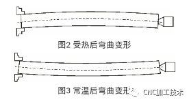 零件在机械加工过程中必定会产生切削热,这些切削热一部分被铁屑和切削液带走,一部分传给刀具,还有一部分则传给工件,使零件的温度升高。温度的高低与加工余量大小有很大关系。加工余量大,粗加工时间必然会变长,切削用量也会适当加大,导致切削热不断增加,零件温度不断升高。零件温度升高带来的最大危害就是使零件产生变形,尤其对温度变化比较敏感的材料(如:不锈钢)影响更大,而且这种热变形贯穿整个加工过程,使加工难度增加,产品质量受影响。例如,在加工丝杆类细长轴零件时,由于采用的是一夹一顶加工方法,长度方向的自由度受到了限制,此时工件温度若过高则会产生热膨胀。在长度方向的延伸受阻情况下,工件受应力影响必然会产生弯曲变形,给后期加工带来很大的麻烦。受热后工件弯曲变形图如图2所示。这时如继续加工,将凸出部分加工直至成品,待冷却至常温后零件在应力作用下又会产生反向变形,造成形位误差而影响质量。常温后工件弯曲变形图如图3所示。直径方向膨胀后其增大部分会被切除,待工件冷却后则产生圆柱度和尺寸误差。精密丝杆磨削时,工件的热变形还会引起螺距的误差。