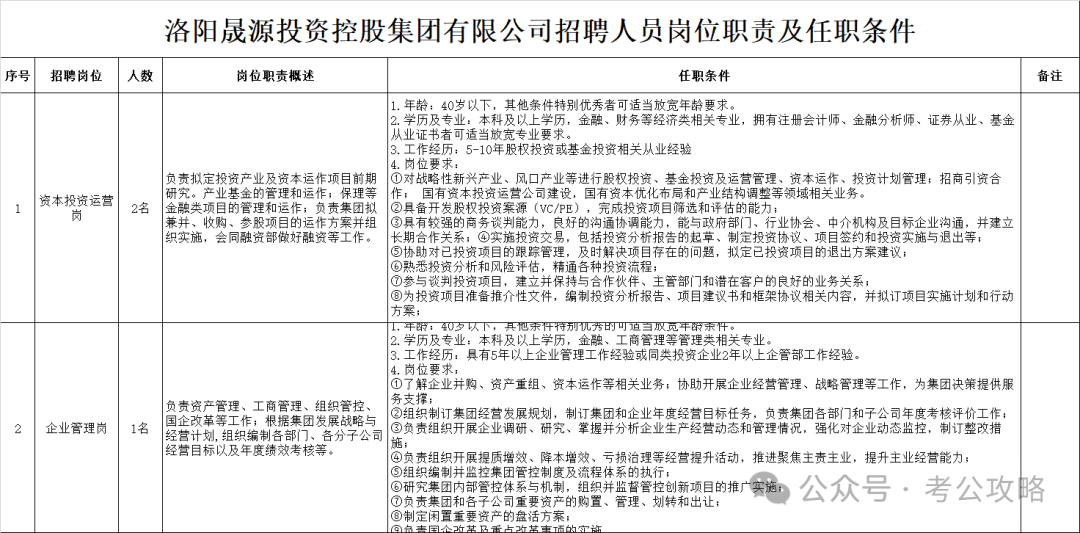 岗位职责及任职条件详见《洛阳晟源投资控股集团有限公司招聘人员岗位职责及任职条件》(附件1)。