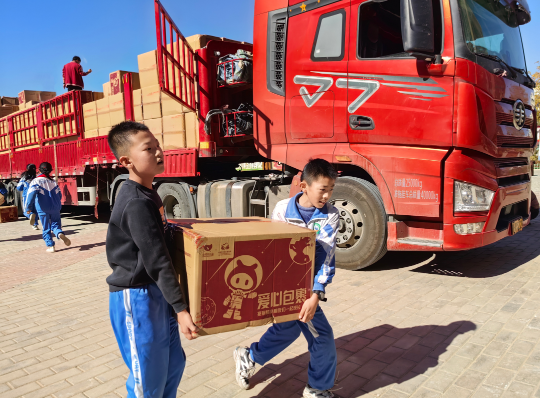 同学们兴奋地跑来帮忙卸车