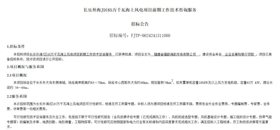 1月26日,我们了解到福易采电子交易平台发布《长乐外海J区65万千瓦海上风电项目前期工作技术咨询服务招标公告》。