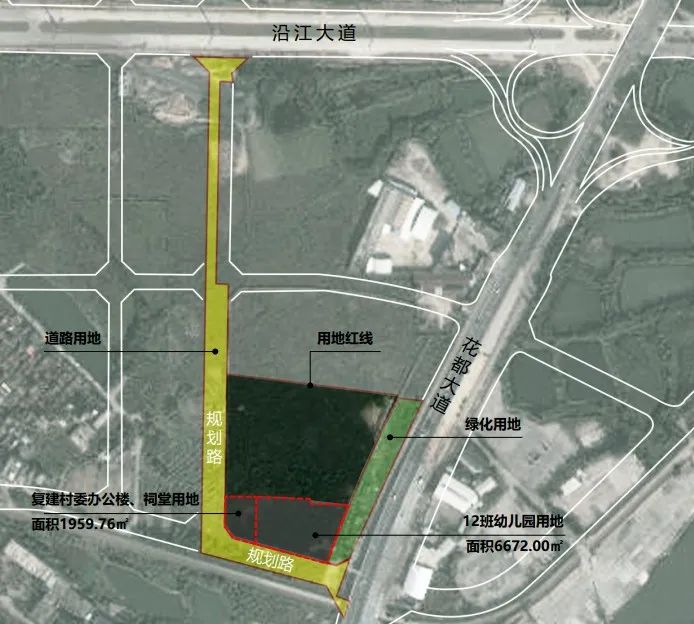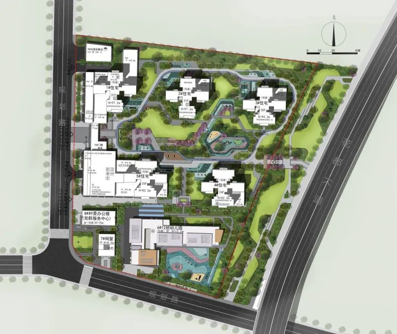 拟建5栋安置房,地上最高31层,地下2层建筑高度为97.2米,住宅裙房1~3层,功能包括电房、社区卫生服务站、居民健身场所、文化室、托老所、2班托儿所、社区居委会、公厕、村社要求配置复建的其他公共服务设施,还有3层12班幼儿园、1层垃圾收集站、3层复建村委办公楼、1层复建祠堂;净用地红线外的市政道路及城市绿地不在本次工程范围。