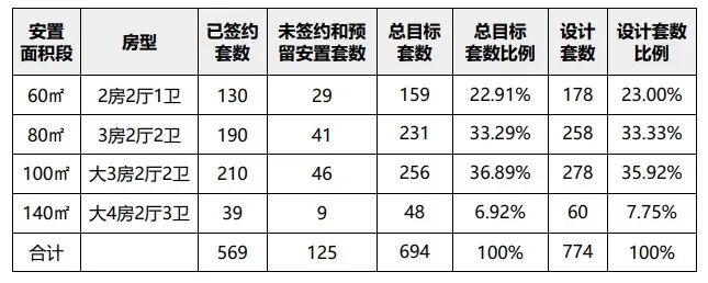 按照设计任务书要求,采用套内面积60㎡、80㎡、100㎡、140㎡四种户型,对应户型套数满足任务书要求,并且本方案总安置套数(774套)比目标套数(694套)富余80套,满足安置需求。