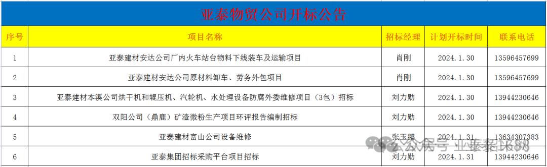 亚泰物贸公司2024年1月招标公告