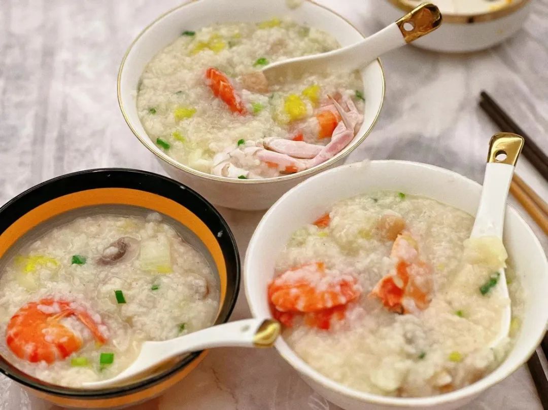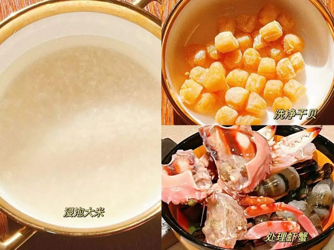 4. 熬粥:将汤底倒入砂锅,放入大米,充分搅拌,煮沸后中火熬15分钟,至米粒开花,将浸泡过的干贝、虾、蟹等放入,盖上锅盖中小火熬制5分钟,最后将洗净切块的蔬菜加入砂锅,煮2分钟,最后加少许白胡椒粉和食盐,撒上葱花上桌。