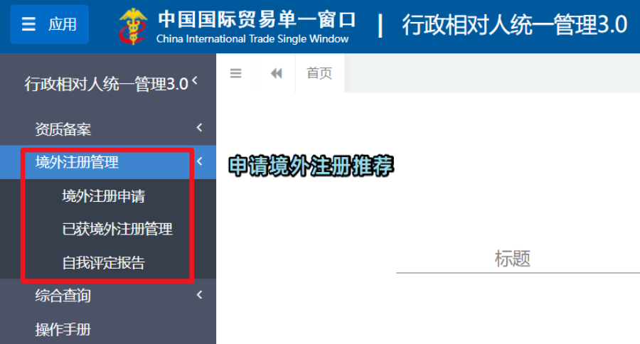 2、新增“企业资质-境外注册管理”功能,实现企业向海关申请境外注册、对已获得的境外注册申请变更和注销以及进行自我评定的功能。