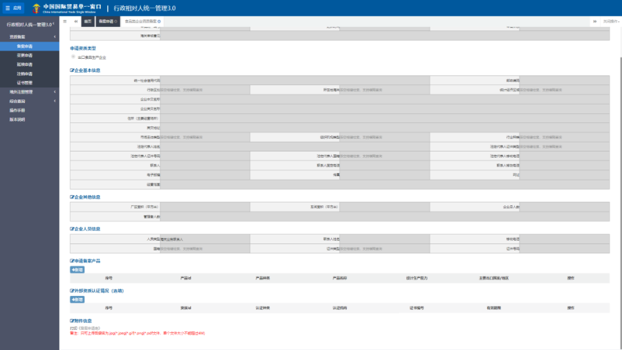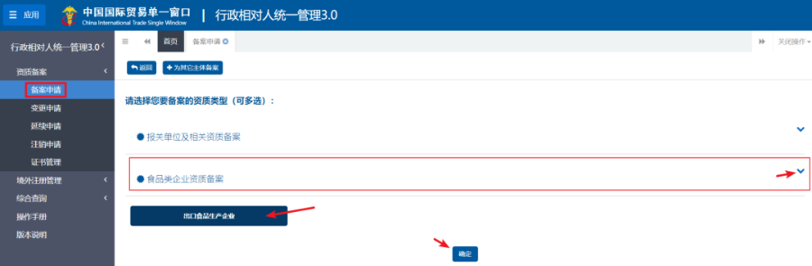 中国国际贸易“单一窗口”标准版应用——企业资质(行政相对人统一管理子系统3.0)新增“出口食品企业备案”和“申请境外注册”功能。