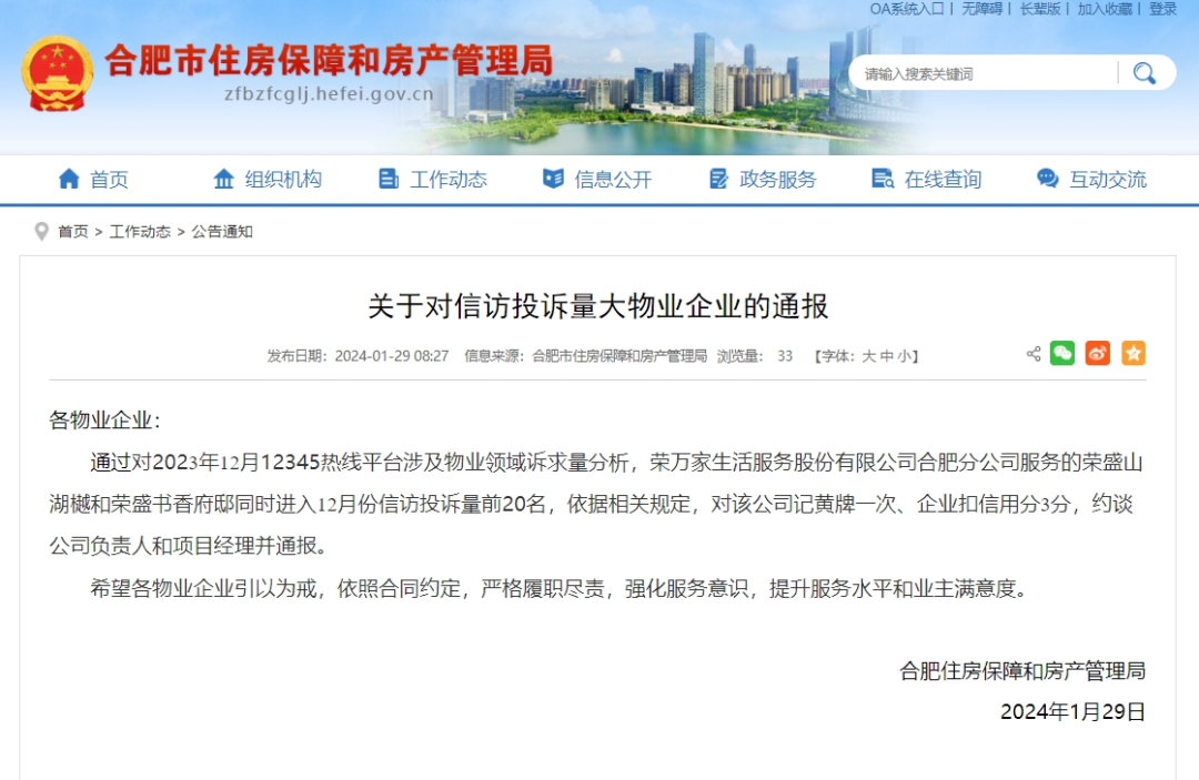 1月29日,合肥住房保障和房产管理局发布《关于对信访投诉量大物业企业的通报》。具体如下: