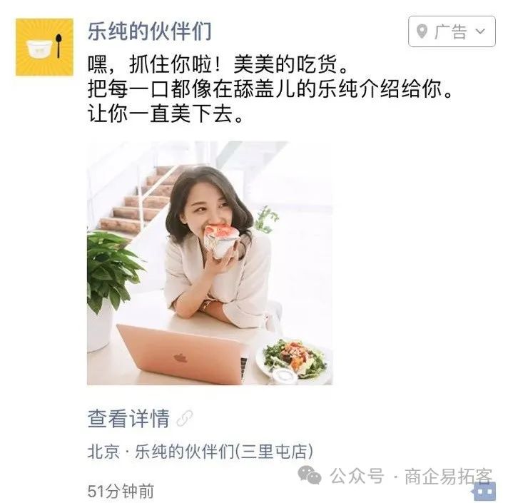 酸奶品牌乐纯的微信公众号“乐纯的伙伴们”在朋友圈投放信息流广告,以推广线上商城酸奶促销活动。由于乐纯酸奶一向走高端路线,深受广大白领女性欢迎,广告也相应地圈定了北京朝阳区爱好旅游、金融、餐饮美食的女性群体。