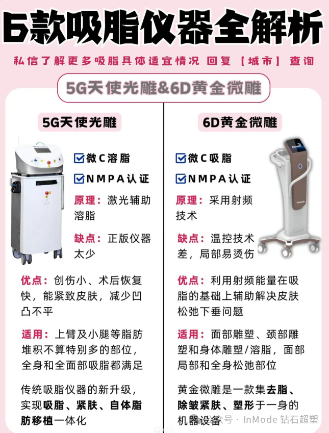 现在常见的6️⃣款仪器:5G天使光雕、6D黄金微雕、钻石精雕、钻石超塑、酷塑、超脂塑