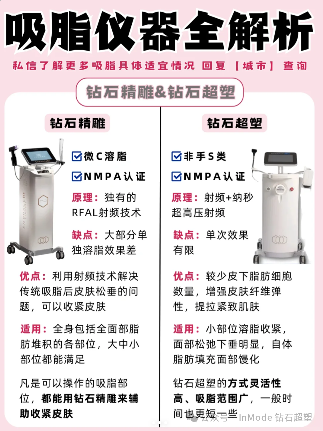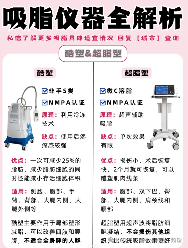 于是一些小姐妹就选择了吸脂这个项目,但是吸脂仪器很多不知道该怎么选择❗️不同部位选择的仪器也不同❗️