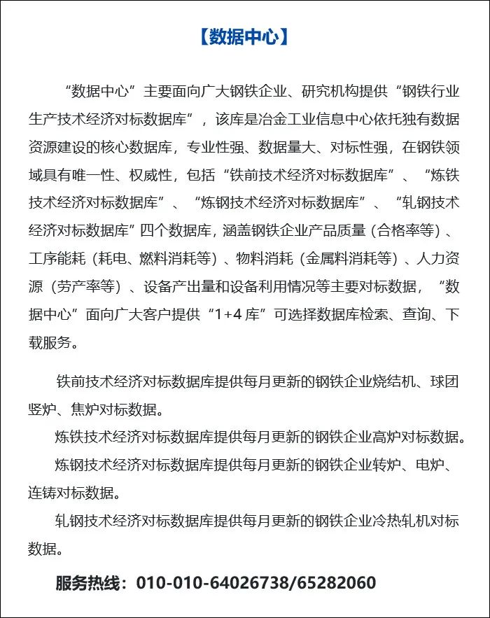 一、根据中国钢铁工业协会委托,长期从事全国重点钢铁企业产量、技经、能耗、投资、财务等信息统计工作;组织开展钢铁行业技术经济对标咨询业务。