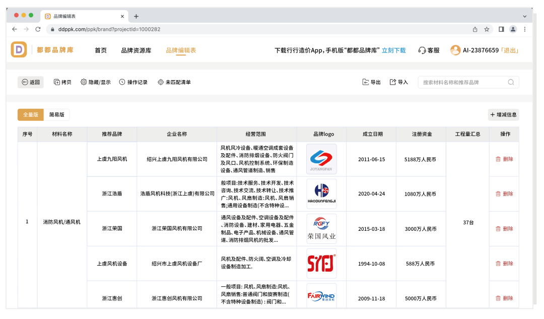 “都都品牌库”APP端口在行行造价APP“供应商库”栏目下,用于随时随地查阅品牌信息。“都都品牌库”网页版网址为: www.ddppk.com,采用“行行造价APP”注册账户和密码登录。“品牌资源库”用于搜索查询建材品牌信息,便捷拷贝企业名称、品牌名称及logo应用于Excel或者Word里进行逐个编辑品牌推荐表。“品牌编辑表”用于项目招标期高效编辑推荐品牌表,导入Xml或Excel格式工程量清单后系统自动生成品牌推荐表的材料类别名称,无需人工查看工程清单,再在Excel或者Word上逐个编辑。材料类别名称行显示材料用量,用于决策是否需要定品牌。导入后系统会自动推荐品牌,可以设置推荐品牌个数,自动推荐品牌根据实际情况再进行调整。完成后可以导出Excel或者Word格式用于编辑招标文件。