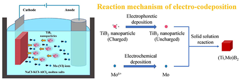 本文提供了一种全新的熔盐电沉积方法,即在合适电压的作用下,NaCl–KCl–AlCl3熔盐中纳米TiB2颗粒的电泳沉积与金属钼离子的电化学沉积能够同时在阴极进行,得到的金属钼与纳米TiB2在阴极基体上发生固溶反应形成(Ti, Mo)B2复合涂层。该方法已获授权发明专利一项。该研究是肖赛君团队探索发现的“高温熔盐中纳米颗粒电泳沉积”方向的拓展,已被国际科技机构Advances in Engineering进行专题报道。(链接:https://advanceseng.com/synthesis-ti-mob2-coating-electro-codeposition-molten-salts-i-e-combination-electrochemical-electrophoretic-deposition/)。
