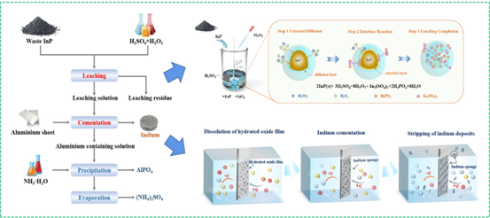 2023年7月,安徽工业大学张晓峰(第一作者),徐亮、赵卓(通讯作者)等在Hydrometallurgy上发表了题为“Oxidative acid leaching of indium phosphide waste and recovery of indium metal by cementation with aluminum”的研究论文。
