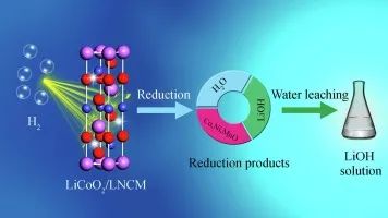 本文不同于传统废旧锂离子电池的还原浸出和碳热还原,而是开展了基于氢还原的工艺与理论研究。热力学计算和实验结果发现LiCoO2和LiNi1/3Co1/3Mn1/3O2在低还原温度下即可在氢气气氛中转化为可溶性LiOH。同时正极粉末中的高价过渡金属被还原为低价过渡金属状态,有利于后续的酸浸过程。由于还原产物的核壳和多孔结构,生成的LiOH易浸出到水中。对于LiCoO2和LiNi1/3Co1/3Mn1/3O2,浸出率分别达到98.03%和99.36%,锂浓度分别达到23.6和23.9 g/L。该方法操作简单,不产生有害物质。因此,基于氢还原-水浸的回收技术环境友好、可行性强,在工业生产中具有很大的实际应用前景。